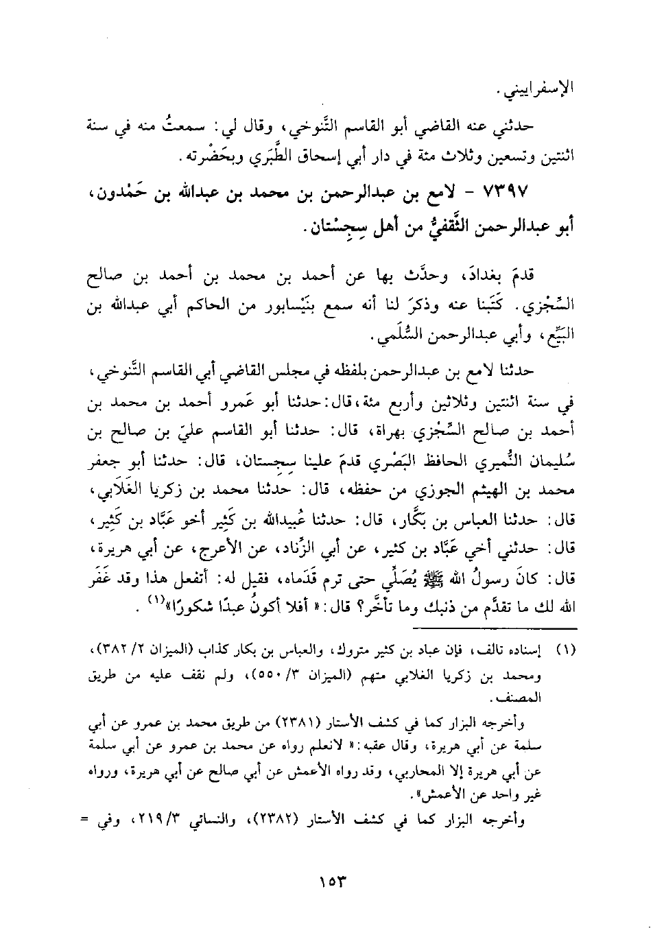(4659) -[16: 153] حَدَّثَنَا لامِعُ بْنُ عَبْدِ الرَّحْمَنِ بِلَفْظِهِ فِي مَجْلِسِ الْقَاضِي أَبِي الْقَاسِمِ التَّنُوخِيُّ، فِي سَنَةِ اثْنَتَيْنِ وَثَلاثِينَ وَأَرْبَعِ مِائَةٍ، قَالَ: حَدَّثَنَا أَبُو عَمْرٍو أَحْمَدُ بْنُ مُحَمَّدِ بْنِ أَحْمَدَ بْنِ صَالِحٍ السِّجْزِيُّ، بِهَرَاةَ، قَالَ: حَدَّثَنَا أَبُو الْقَاسِمِ عَلِيُّ بْنُ صَالِحِ بْنِ سُلَيْمَانَ النُّمَيْرِيُّ الْحَافِظُ الْبَصْرِيُّ، قَدِمَ عَلَيْنَا سِجِسْتَانَ، قَالَ: حَدَّثَنَا أَبُو جَعْفَرٍ مُحَمَّدُ بْنُ الْهَيْثَمِ الْجَوْزِيُّ مِنْ حِفْظِهِ، قَالَ: حَدَّثَنَا مُحَمَّدُ بْنُ زَكَرِيَّا الْغَلابِيُّ، قَالَ: حَدَّثَنَا الْعَبَّاسُ بْنُ بَكَّارٍ، قَالَ: حَدَّثَنَا عُبَيْدُ اللَّهِ بْنُ كَثِيرٍ أَخُو عَبَّادِ بْنِ كَثِيرٍ، قَالَ: حَدَّثَنِي أَخِي عَبَّادُ بْنُ كَثِيرٍ، عَنْ أَبِي الزِّنَادِ، عَنِ الأَعْرَجِ، عَنْ أَبِي هُرَيْرَةَ، قَالَ: كَانَ رَسُولُ اللَّهِ، صَلَّى اللَّهُ عَلَيْهِ وَسَلَّمَ يُصَلِّي حَتَّى تَرِمَ قَدَمَاهُ، فَقِيلَ لَهُ: أَتَفْعَلُ هَذَا وَقَدْ غَفَرَ اللَّهُ لَكَ مَا تَقَدَّمَ مِنْ ذَنْبِكَ وَمَا تَأَخَّرَ؟ قَالَ: " أَفَلا أَكُونُ عَبْدًا شَكُورًا "