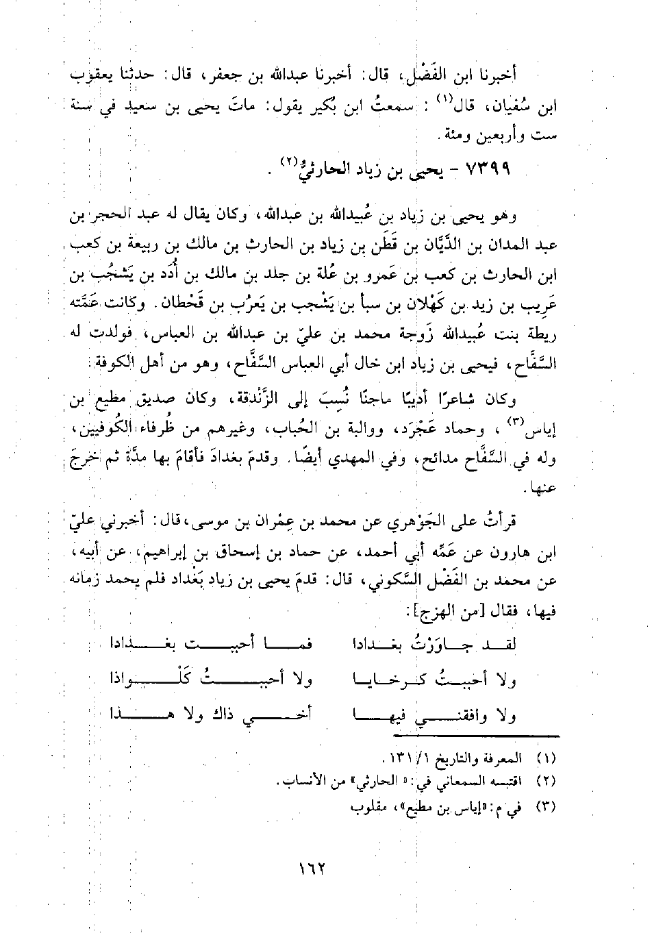 قرأت على الجوهري، عن محمد بن عمران بن موسى، قال: أَخْبَرَنِي علي بن هارون، عن عمه أبي أحمد، عن حماد بن إسحاق بن إبراهيم، عن أبيه، عن محمد بن الفضل السكوني، قال: قدم يحيى بن زياد بغداد فلم يحمد زمانه فيها، فقال: