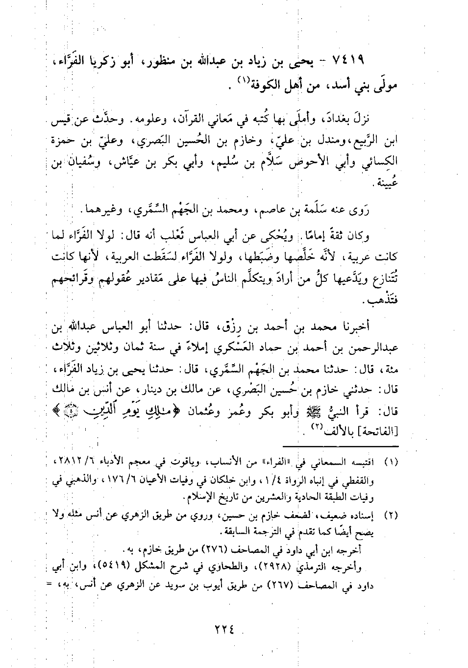 7419 - يَحْيَى بْن زياد بْن عَبْد الله بْن منظور أَبُو زكريا الفَرَّاء مولى بَنِي أسد من أهل الكوفة،