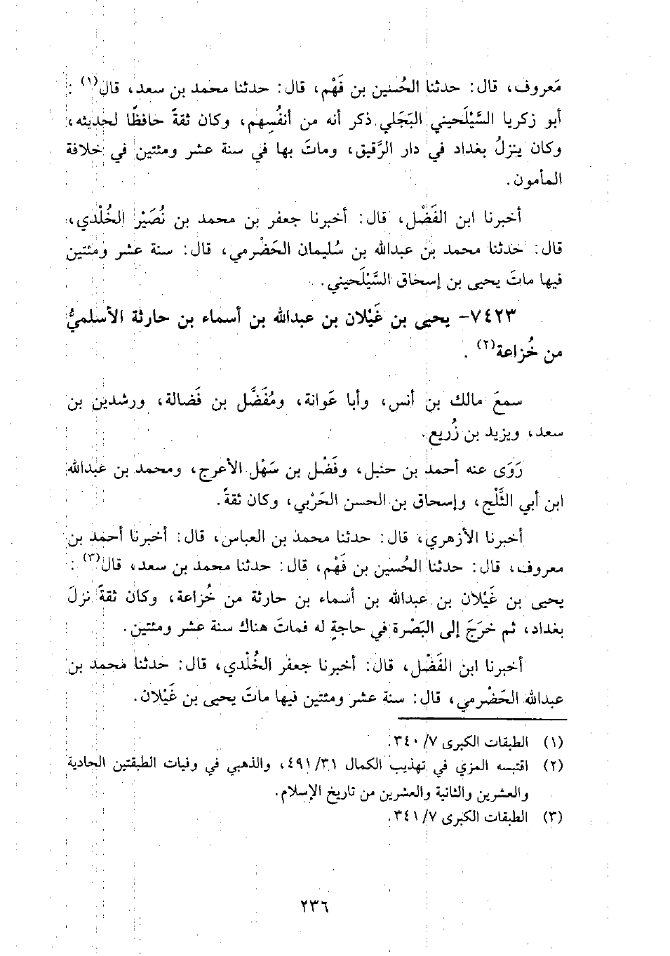 7423 - يحيى بن غيلان بن عبد الله بن أسماء بن حارثة الأسلمي من خزاعة سَمِعَ: مالك بن أنس، وأبا عوانة، ومفضل بن فضالة، ورشدين بن سعد، ويزيد بن زريع.