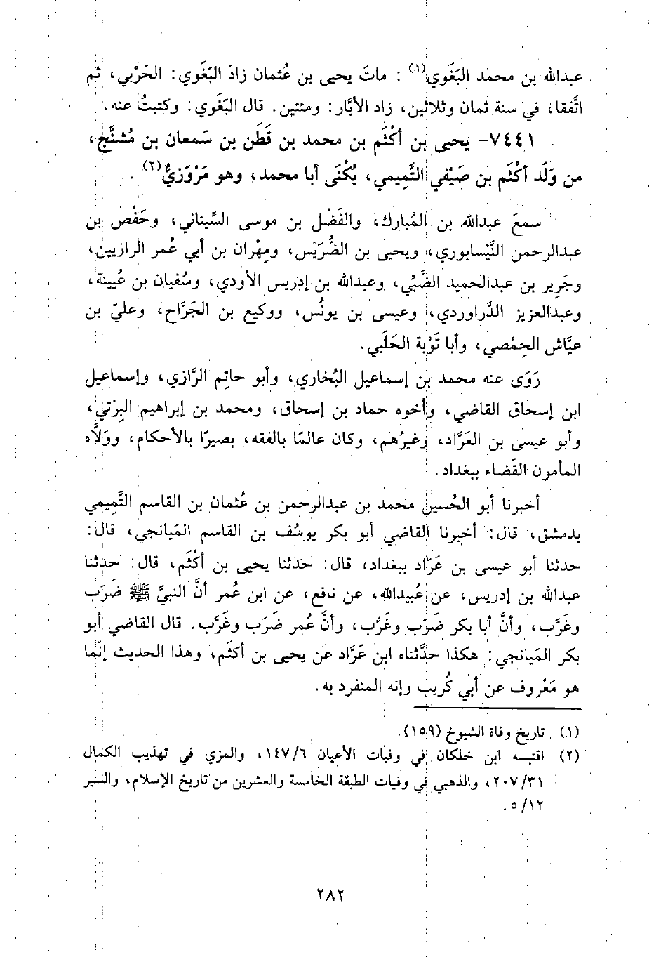 7441 - يحيى بن أكثم بن محمد بن قطن بن سمعان بن مشنج من ولد أكثم بن صيفي التميمي يكنى أبا محمد وهو مروزي