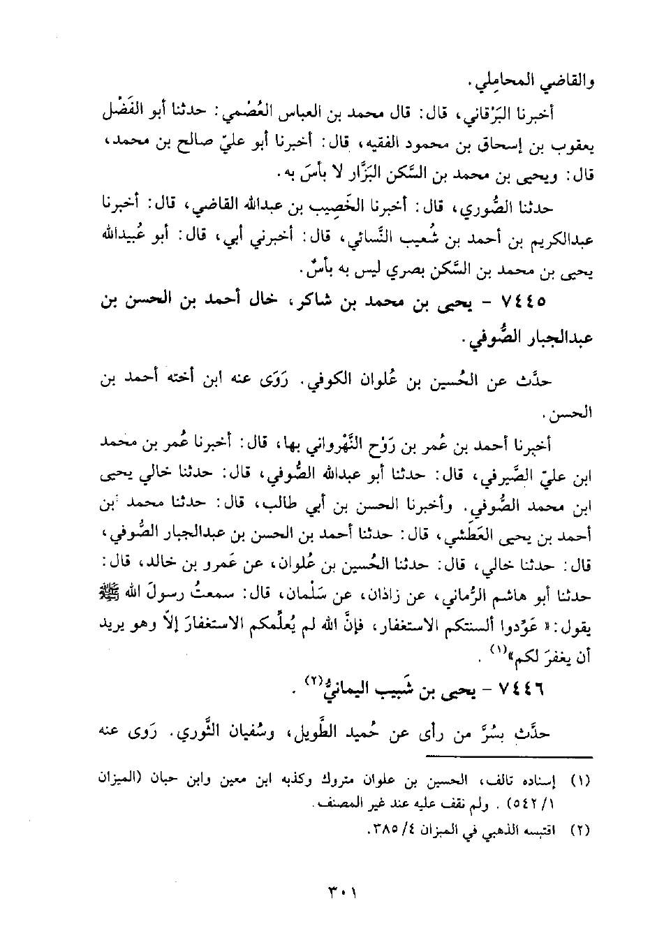 7445 - يحيى بن محمد بن شاكر خال أحمد بن الحسن بن عبد الجبار الصوفي حدث عن: الحسين بن علوان الكوفي.