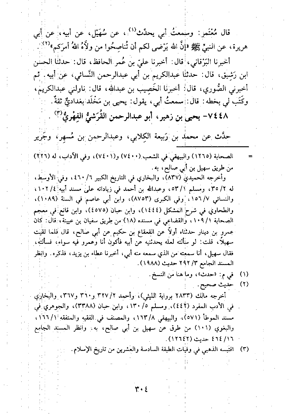7448 - يحيى بن زهير أبو عبد الرحمن القرشي الفهريُّ حدث عن: محمد بن ربيعة الكلابي، وعبد الرحمن بن مسهر، وجرير ابن عبد الحميد، وأزهر بن سعد السمان.