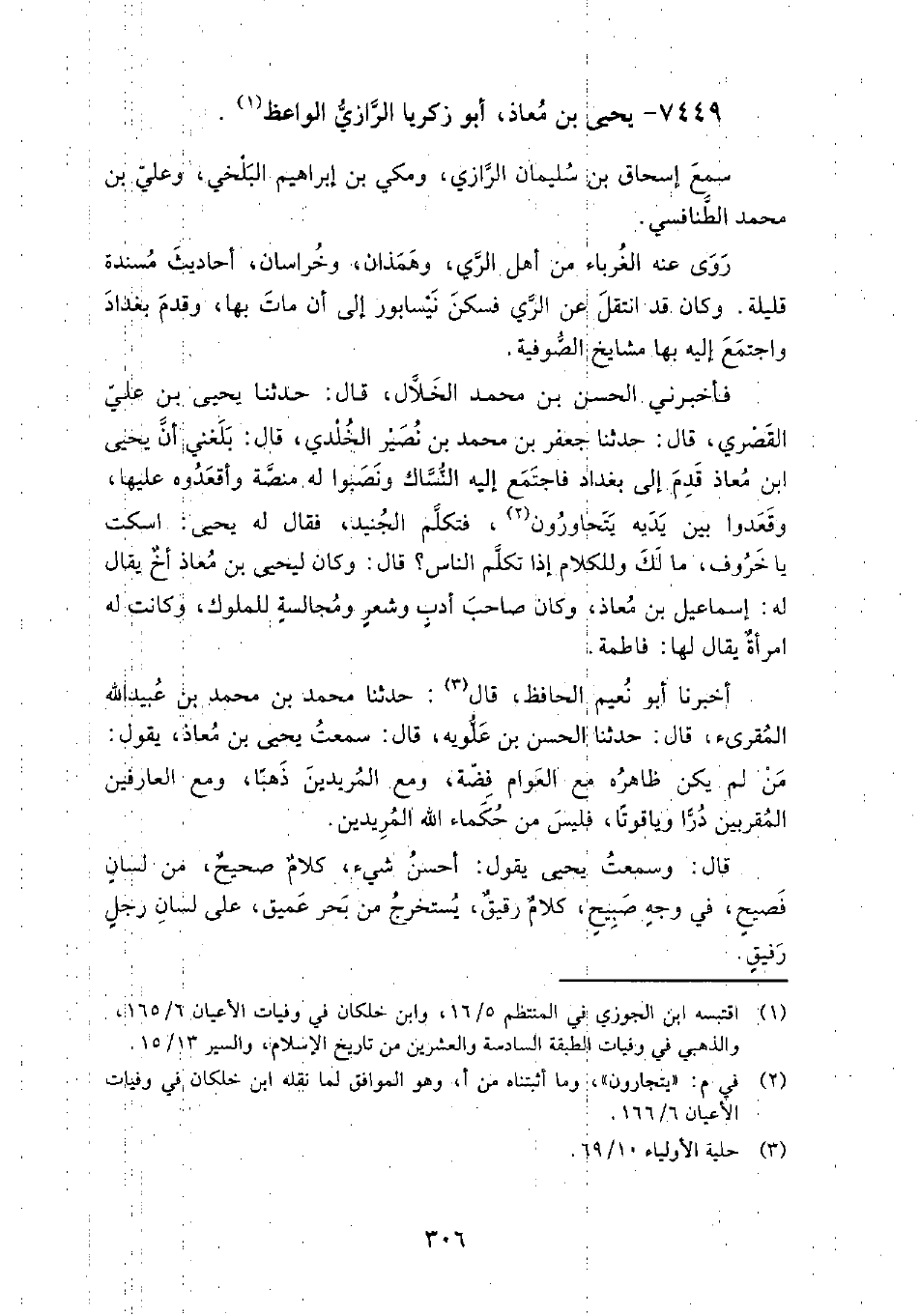 7449 - يحيى بن معاذ أبو زكريا الرازي الواعظ سَمِعَ: إسحاق بن سليمان الرازي، ومكي بن إبراهيم البلخي، وعلي بن محمد الطنافسي.