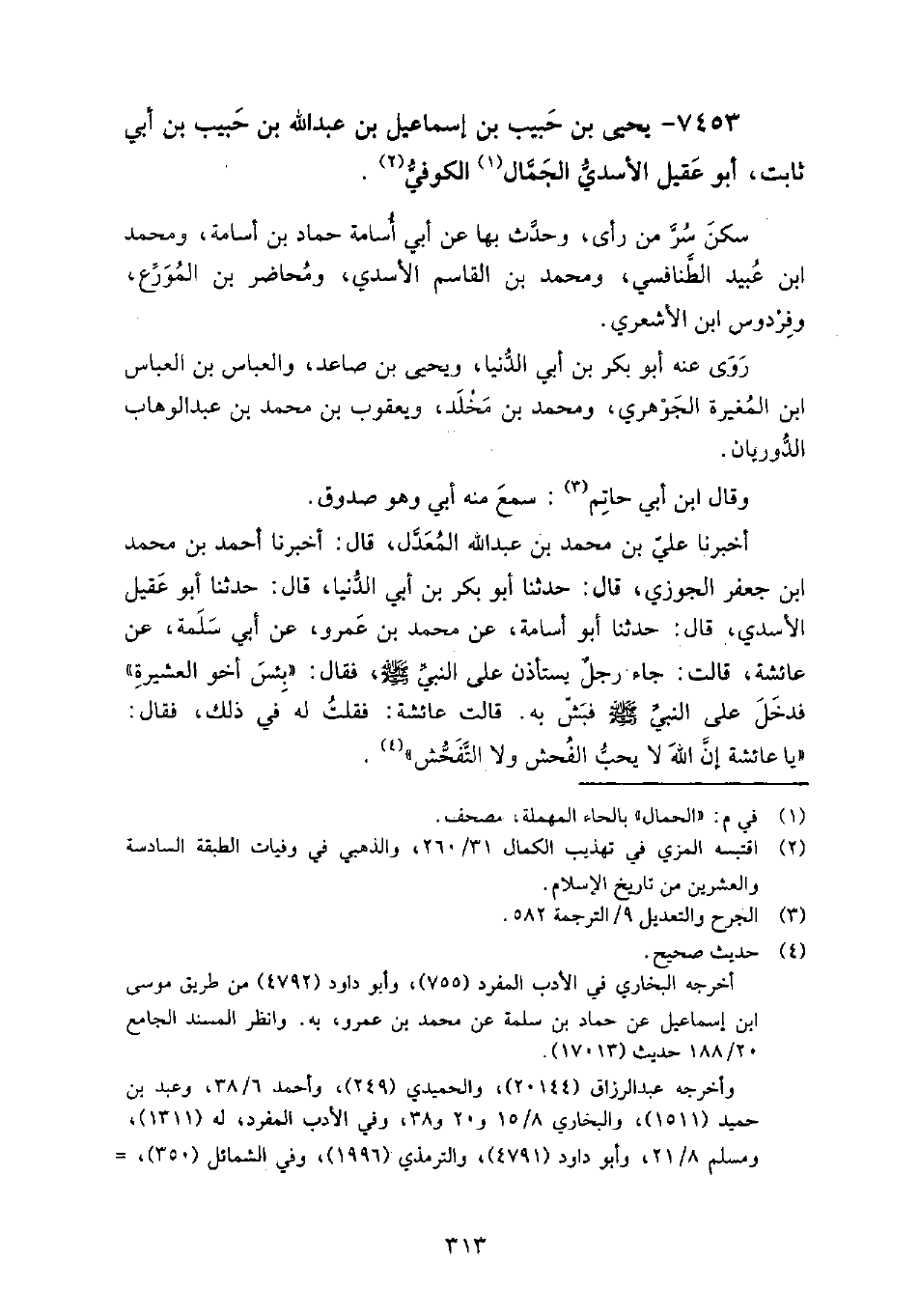 7453 - يحيى بن حبيب بن إسماعيل بن عبد الله بن حبيب بن أبي ثابت أبو عقيل الأسدي الجمال الكوفي سكن سر من رأى، وحدث بِها عن: أبي أسامة حماد بن أسامة، ومحمد بن عبيد الطنافسي، ومحمد بن القاسم الأسدي، ومحاضر بن المورع، وفردوس ابن الأشعري.