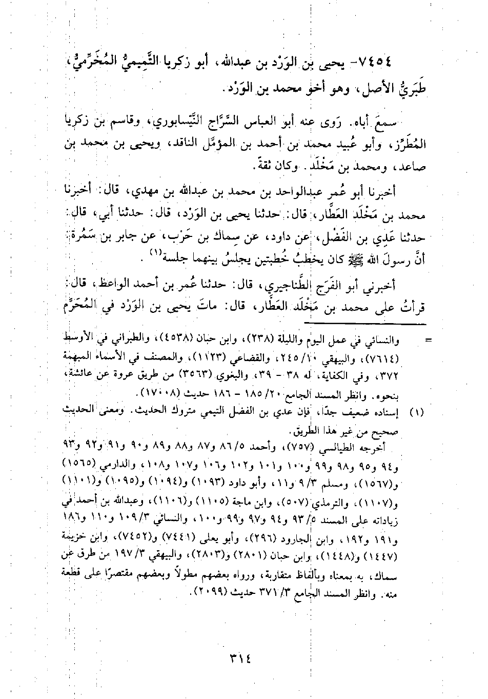 7454 - يَحْيَى بْن الورد بْن عَبْد الله أَبُو زكريا التميمي المخرمي طبري الأصل وهو أخو مُحَمَّد بْن الورد سَمِعَ: أباهُ، روى عَنْهُ: أَبُو الْعَبَّاس السراج النيسابوري، وقاسم بْن زكريا المطرز، وأبو عُبَيْد مُحَمَّد بْن أَحْمَد بْن المؤمل الناقد، ويحيى بْن مُحَمَّد بْن صاعد، وَمُحَمَّد بْن مخلد.