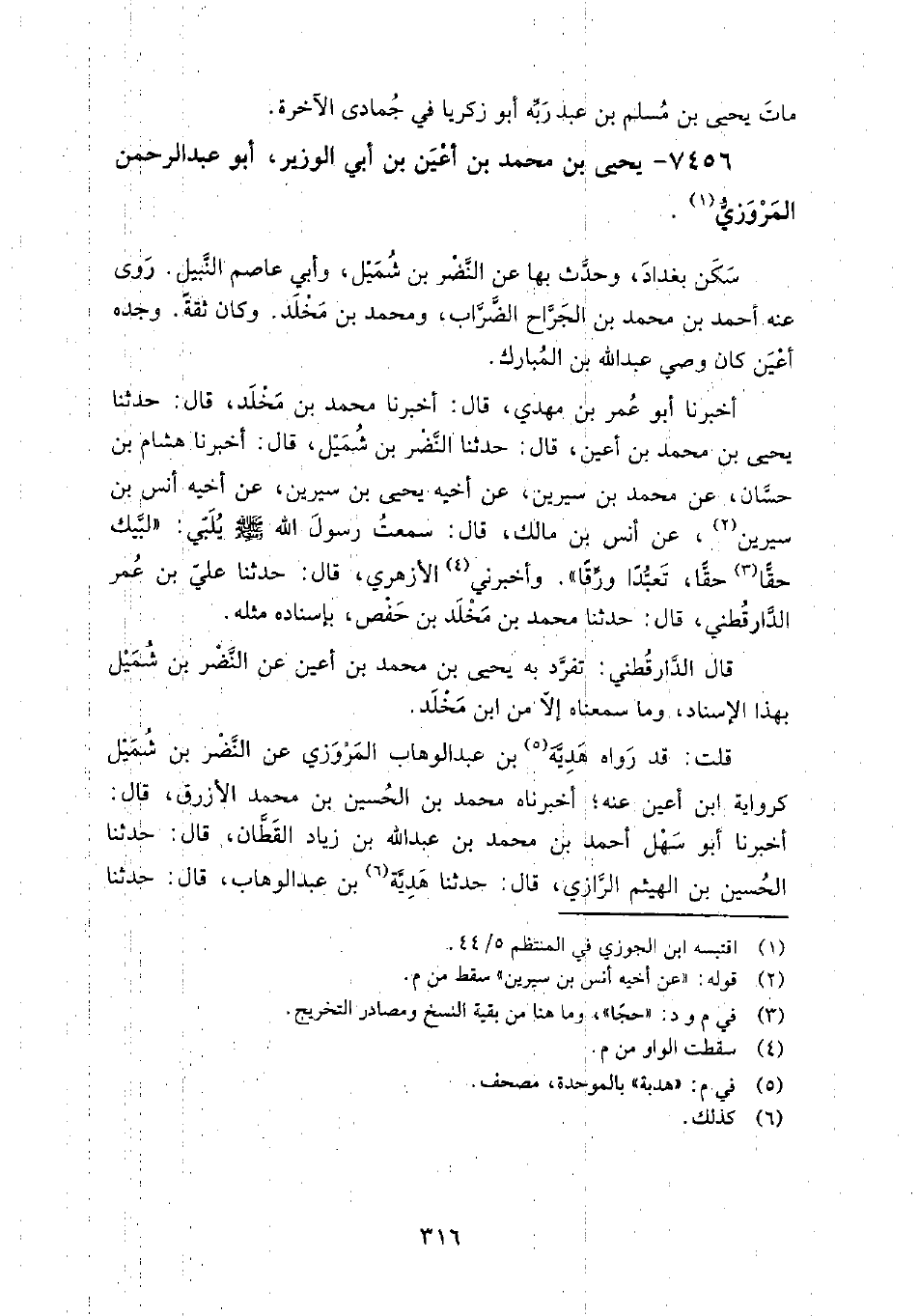 7456 - يَحْيَى بْن مُحَمَّد بْن أعْيَن بْن أبي الوزير أَبُو عَبْد الرَّحْمَن الْمَرْوَزِيّ سكن بغداد، وحدث بِهَا عَن: النضر بْن شُميل، وأبي عاصم النبيل.