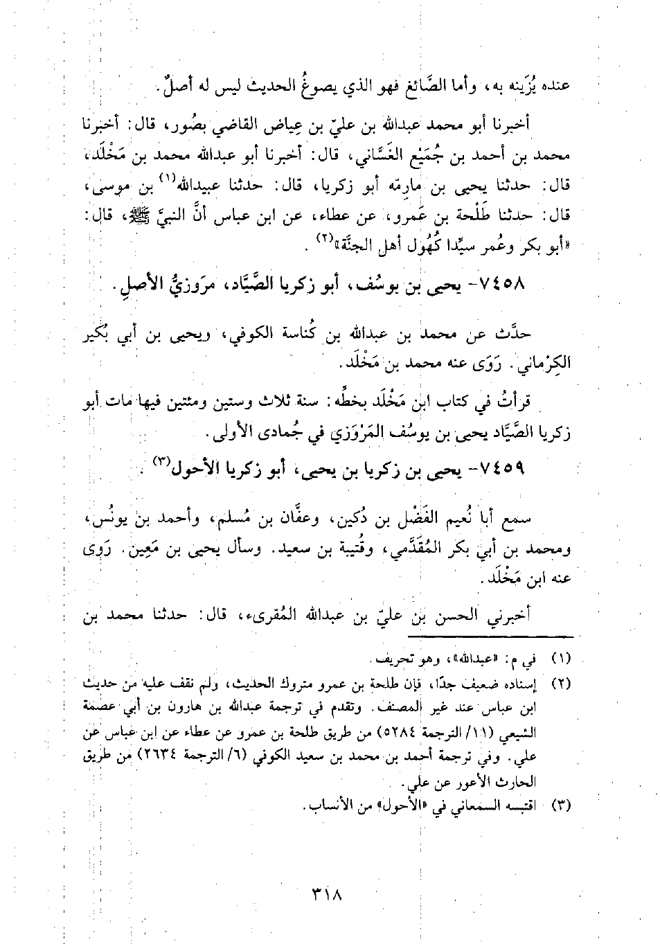 7458 - يحيى بن يوسف أبو زكريا الصياد مروزي الأصل حدث عن: محمد بن عبد الله بن كناسة الكوفي، ويحيى بن أبي بكير الكرماني.
