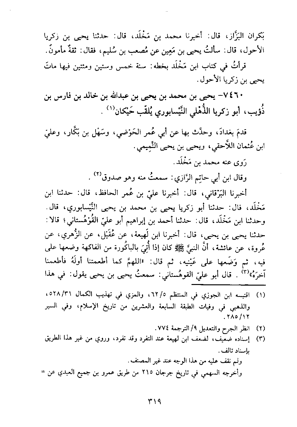 7460 - يحيى بن محمد بن يحيى بن عبد الله بن خالد بن فارس بن ذؤيب أبو زكريا الذهلي النيسابوري يلقب حيكان قدم بغداد، وحدث بِهَا عن: أبي عمر الحوضي، وسهل بن بكار، وعلي بن عثمان اللاحقي، ويحيى بن يحيى التميمي.
