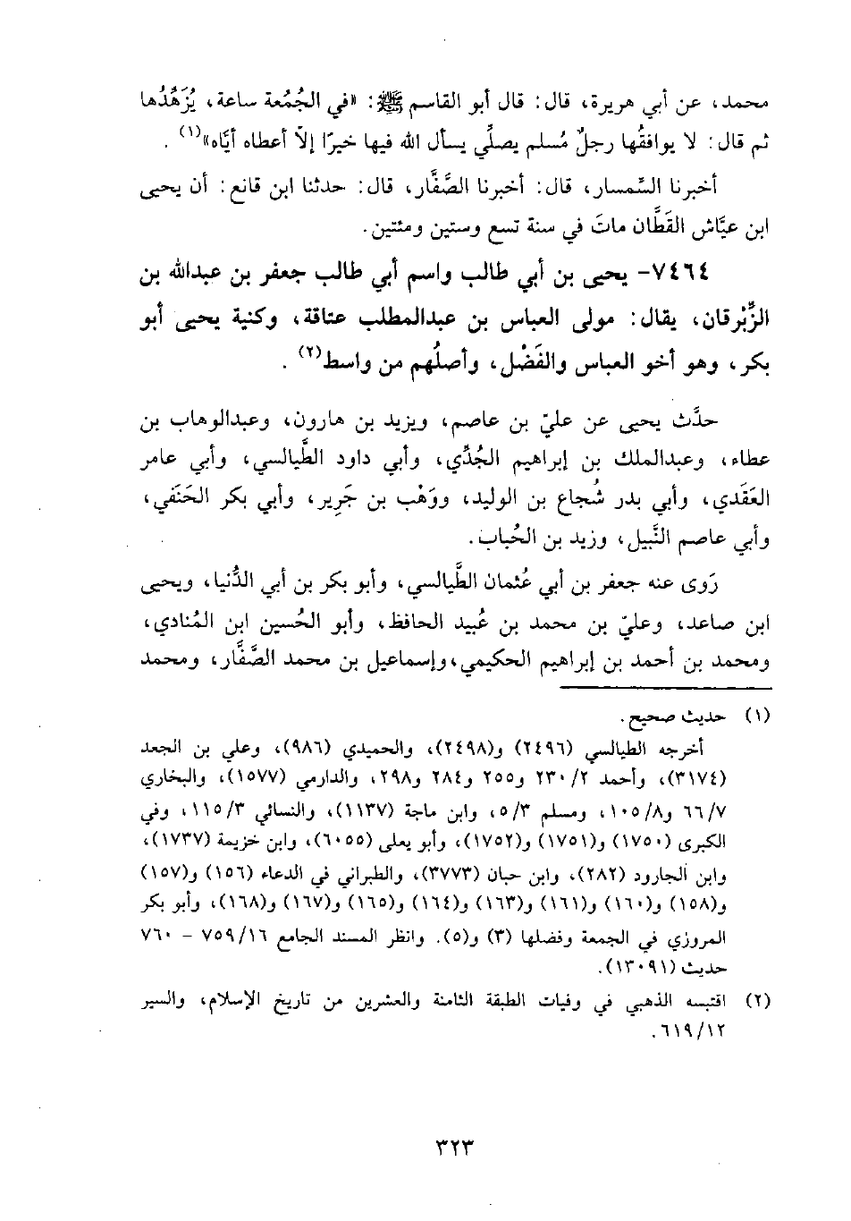 7464 - يَحْيَى بْن أبي طالب واسم أبي طالب جَعْفَر بْن عَبْد الله بْن الزبرقان يُقال مولى الْعَبَّاس بْن عَبْد المطلب عتاقة وكنية يَحْيَى أَبُو بَكْر وهو أخو الْعَبَّاس والفضل وأصلهم من واسط حَدَّث يَحْيَى عَن: عَلِيّ بْن عاصم، ويزيد بْن هارون، وعبد الوهاب بْن عطاء، وعبد الملك بْن إِبْرَاهِيم الجدي، وأبي داود الطيالسي، وأبي عامر العقدي، وأبي بدر شُجاع بْن الوليد، ووهب بْن جرير، وأبي بَكْر الحنفي، وأبي عاصم النبيل، وزيد بْن الْحُباب.