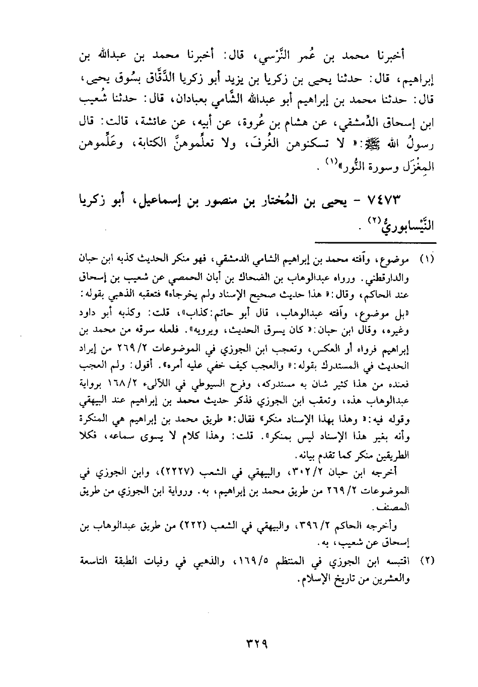 7473 - يَحْيَى بْن المختار بْن منصور بْن إِسْمَاعِيل أَبُو زكريا النيسابوري سكن بغداد، وحدث بِهَا عَن: سُلَيْمَان بْن سلمة الحمصي، والحسن بْن مُحَمَّد بْن عُمَر الشامي، وعيسى بْن يونُس الفاخوري الرَّملي، والقاسم بْن مُحَمَّد، وَمُحَمَّد بْن مكي المروزيين.