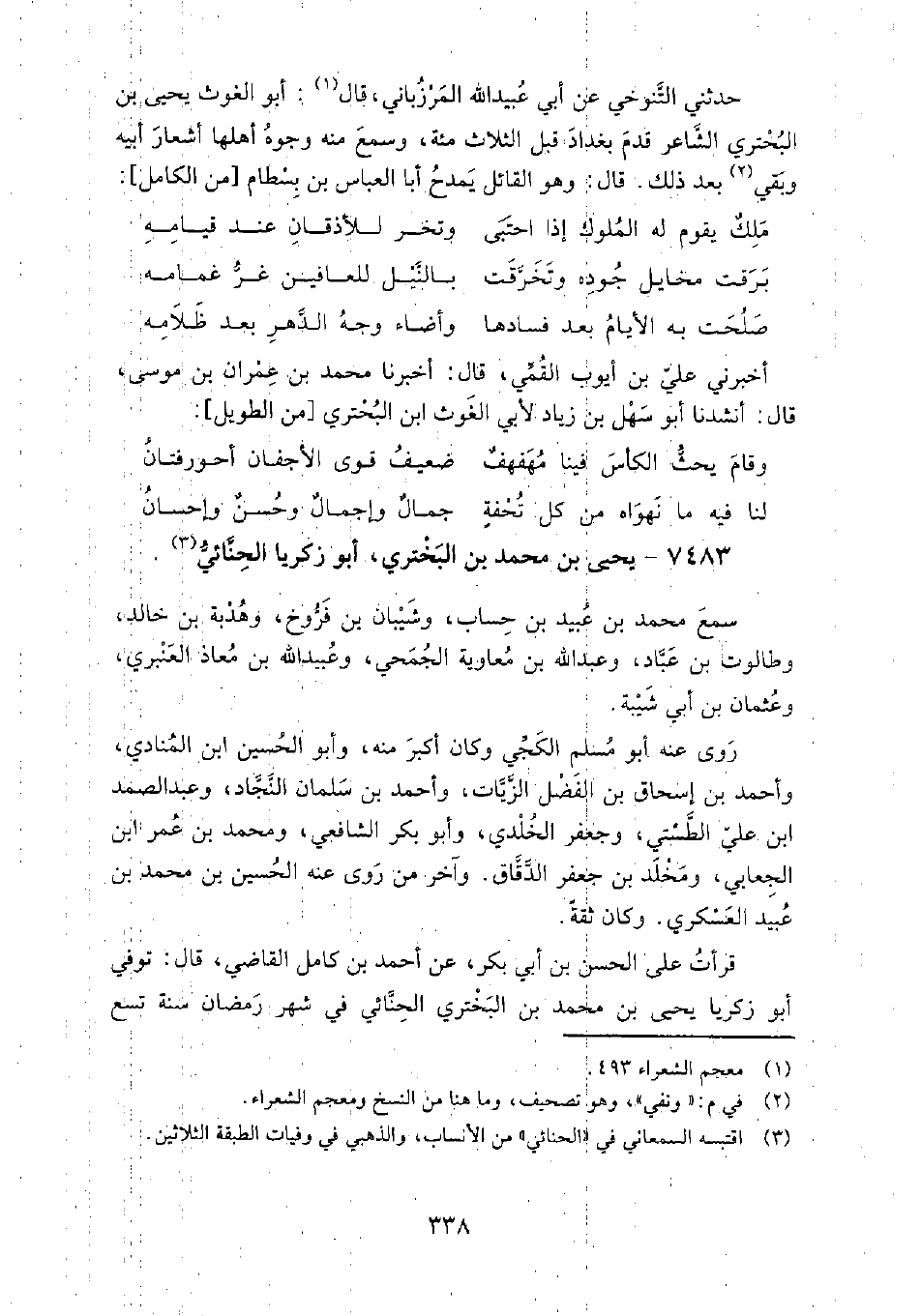 7483 - يَحْيَى بْن مُحَمَّد بْن البختري أَبُو زكريا الْحِنَّائي سَمِعَ: مُحَمَّد بْن عُبيد بْن حِسَاب، وشَيْبَان بْن فَرُّوخ، وهُدْبة بْن خَالِد، وطالوت بْن عبَّاد، وعبد الله بْن مُعاوية الجمحي، وعبيد الله بْن معاذ العنبري، وعثمان بْن أبي شيبة.