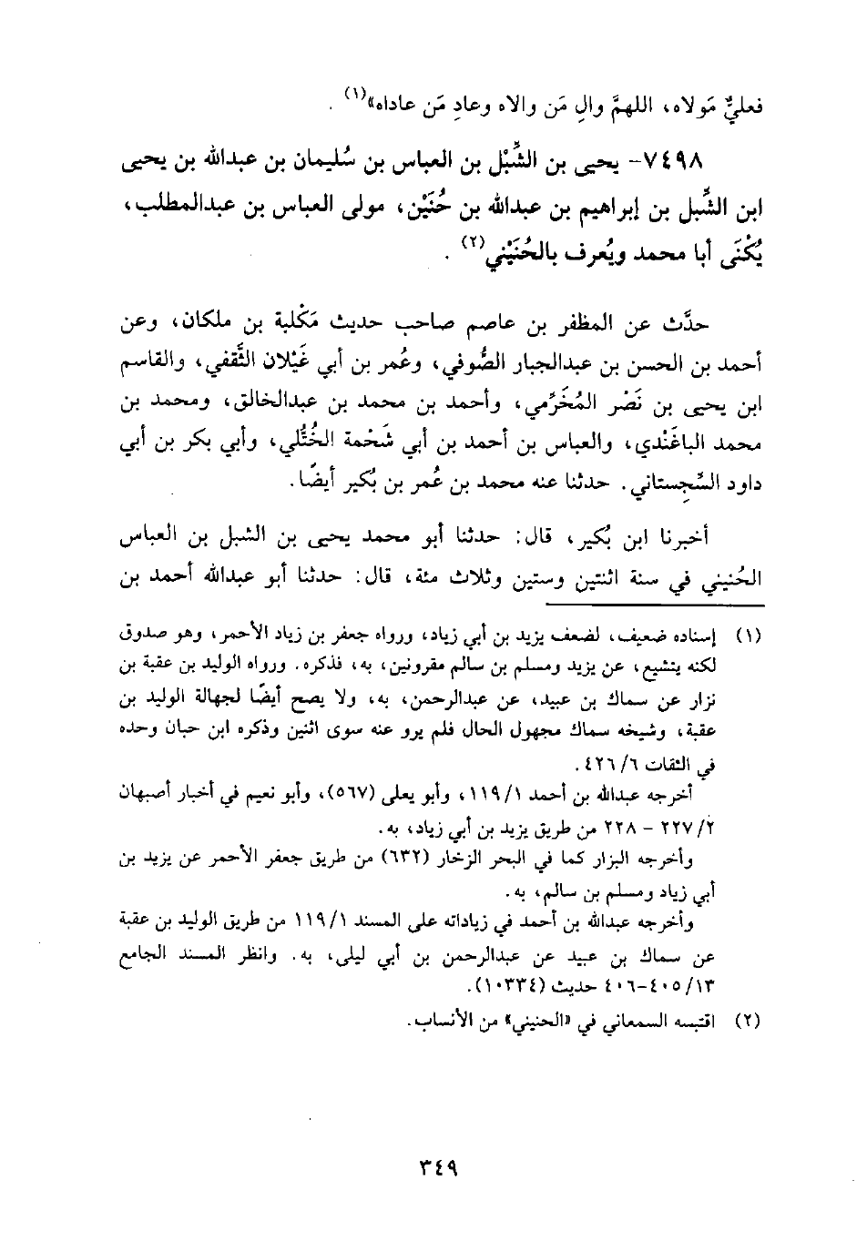 7498 - يَحْيَى بْن الشبل بْن الْعَبَّاس بْن سُلَيْمَان بْن عَبْد الله بْن يَحْيَى بْن الشبل بْن إِبْرَاهِيم بْن عَبْد الله بْن حنين مولى الْعَبَّاس بْن عَبْد المطلب يُكْنَى أَبَا مُحَمَّد ويُعرف بالحنيني حَدَّث عَن: المظفر بْن عاصم صاحب حديث مكلبة بْن ملكان، وعن أَحْمَد بْن الْحَسَن بْن عبد الجبار الصوفي، وعُمر بْن أبي غَيْلان الثقفي، والقاسم بْن يَحْيَى بْن نصر المخرمي، وَأَحْمَد بْن مُحَمَّد بْن عَبْد الخالق، وَمُحَمَّد بْن مُحَمَّد الباغندي، والْعَبَّاس بْن أَحْمَد بْن أبي شحمة الْخُتلي، وأبي بَكْر بْن أبي داود السجستاني.