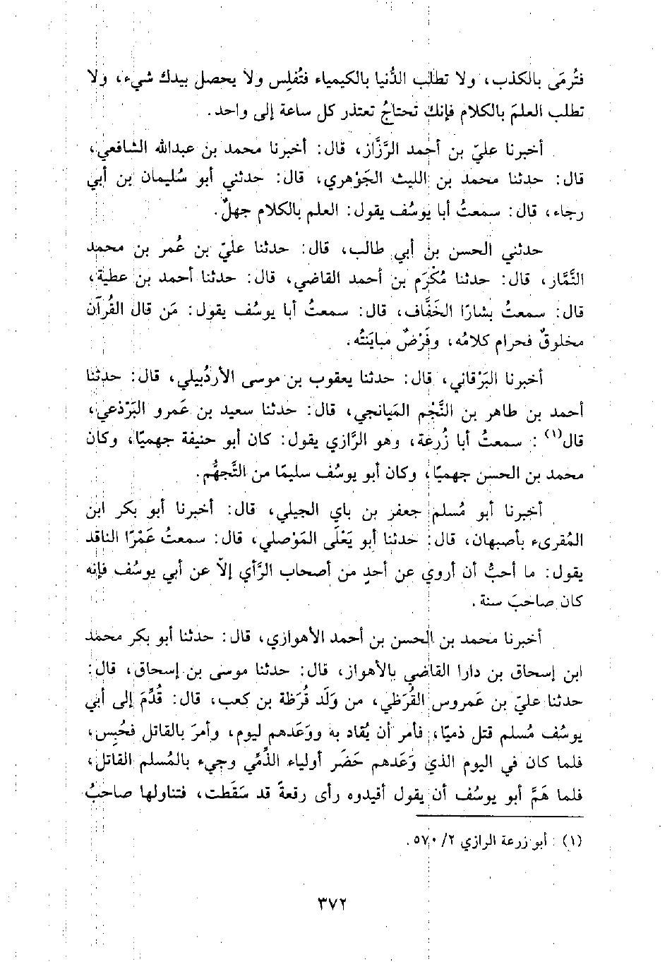 فترمى بالكذب، ولا تطلب الدُّنْيَا بالكيمياء فتُفلس، ولا يحصل بيدك شيء، ولا تطلب العلم بالكلام فإنك تحتاج تعتذر كل ساعة إلى واحد أَخْبَرَنَا عَلِيّ بْن أَحْمَد الرزاز، قَالَ: أَخْبَرَنَا مُحَمَّد بْن عَبْد الله الشافعي، قَالَ: حَدَّثَنَا مُحَمَّد بْن الليث الجوهري، قَالَ: حدَّثَنِي أَبُو سُلَيْمَان بْن أبي رجاء، قَالَ: سمعتُ أَبَا يوسف، يَقُولُ: العلم بالكلام جهل.