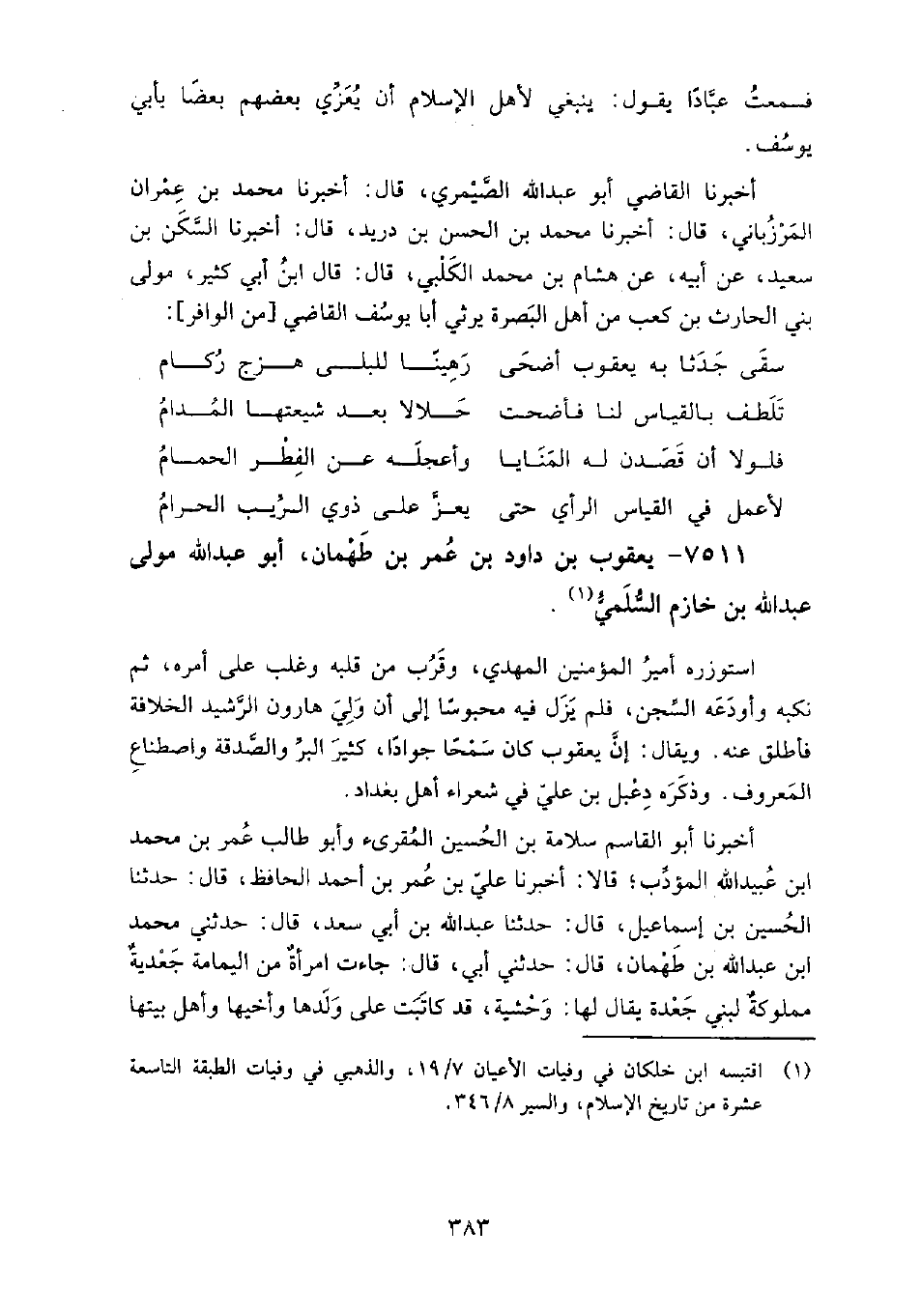 7511 - يعقوب بْن داود بْن عُمَر بْن طهمان أَبُو عَبْد الله مولى عَبْد الله بْن خازم السلمي استوزره أمير المؤمنين المهدي، وقَرُب من قلبه وغلب عَلَى أمره، ثُمَّ نكبه وأودعه السجن، فلم يزل فِيهِ محبوسًا إلى أن ولي هارون الرشيد الخلافة فأطلق عَنْهُ.