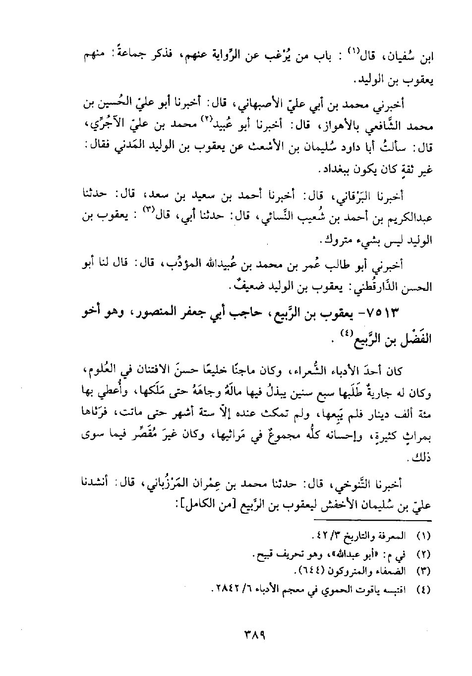 7513 - يعقوب بْن الربيع حاجب أبي جَعْفَر المنصور وهو أخو الفضل بْن الربيع كَانَ أحد الأدباء الشُّعراء، وكان ماجنًا خليعًا، حسنَ الافتنان فِي الْعُلوم، وكان لَهُ جارية طلبها سبع سنين يبذل فيها ماله وجاهه حتى مَلَكها، وأعطي بِهَا مائة ألف دينار فلم يبعها، ولَمْ تمكث عنده إلا ستة أشهر حتى ماتت، فرثاها بمراث كثيرة، وإحسانه كله مجموعٌ فِي مراثيها، وكان غير مُقَصِّر فيما سوى ذَلِكَ.
