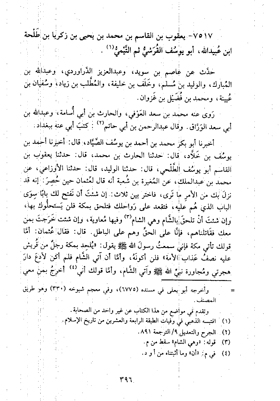 7517 - يعقوب بْن القاسم بْن مُحَمَّد بْن يَحْيَى بْن زكريا بْن طلحة بْن عُبَيْد الله أَبُو يوسف الْقُرَشِيّ ثُمَّ التيمي حَدَّث عَن: عاصم بْن سويد، وعبد العزيز الدَّرَاوَرْدِيّ، وعبد الله بن المبارك، والوليد بن مسلم، وخلف بن خليفة، والمطلب بن زياد، وسفيان بن عيينة، ومحمد بن فضيل بن غزوان.