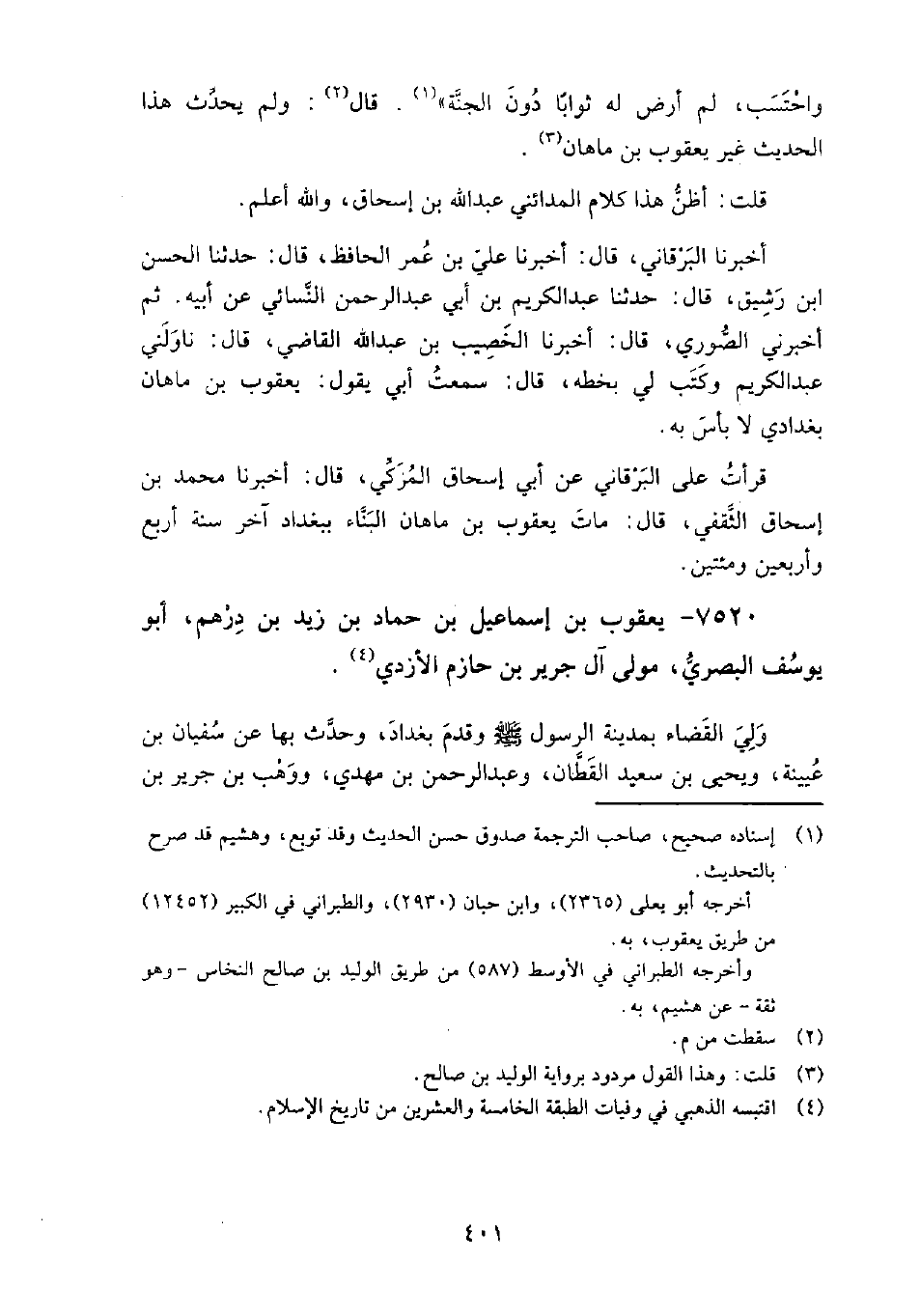 7520 - يعقوب بْن إِسْمَاعِيل بْن حمّاد بْن زيد بْن دِرْهم أَبُو يوسف البصريُّ مولى آل جرير بْن حازم الْأزْدِيّ ولي القضاء بِمدينة الرَّسُول، صَلَّى اللَّهُ عَلَيْهِ وَسَلَّمَ وقدم بغداد، وحدث بِهَا عَن: سُفْيَان بْن عُيَيْنَة، ويحيى بْن سَعِيد القطان، وعبد الرَّحْمَن بْن مهدي، ووهب بْن جرير بْن حازم، وروح بْن عبادة، وأبي عاصم النبيل، وأبي أَحْمَد الزبيري.