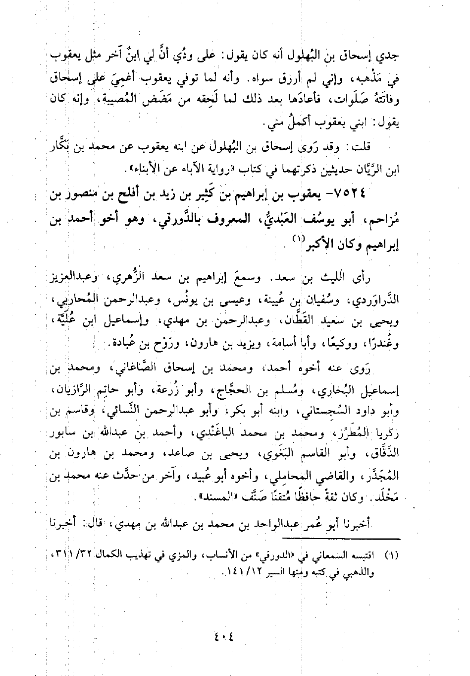 7524 - يعقوب بْن إِبْرَاهِيم بْن كثير بْن زيد بْن أفلح بْن منصور بْن مزاحم أَبُو يوسف العبدي المعروف بالدورقي وهو أخو أَحْمَد بْن إِبْرَاهِيم وكان الأكبر رأى الليث بْن سعد.