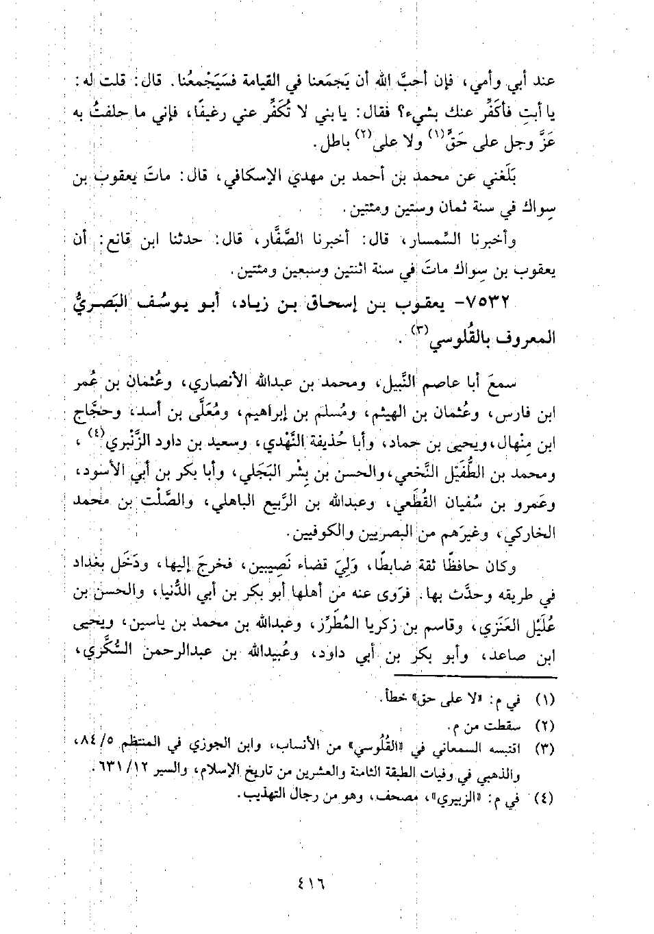 7532 - يعقوب بن إسحاق بن زياد أبو يوسف البصري المعروف بالقلوسي سمع: أبا عاصم النبيل، ومحمد بن عبد الله الأنصاري، وعثمان بن عمر بن فارس، وعثمان بن الهيثم، ومسلم بن إبراهيم، ومُعَلَّى بن أسد، وحجاج بن منهال، ويحيى بن حماد، وأبا حذيفة النهدي، وسعيد بن داود الزنبري، ومحمد بن الطفيل النخعي، والحسن بن بشر البجلي، وأبا بكر بن أبي الأسود، وعمرو بن سفيان القطعي، وعبد الله بن الربيع الباهلي، والصلت بن محمد الخاركي، وغيرهم من البصريين، والكوفيين.