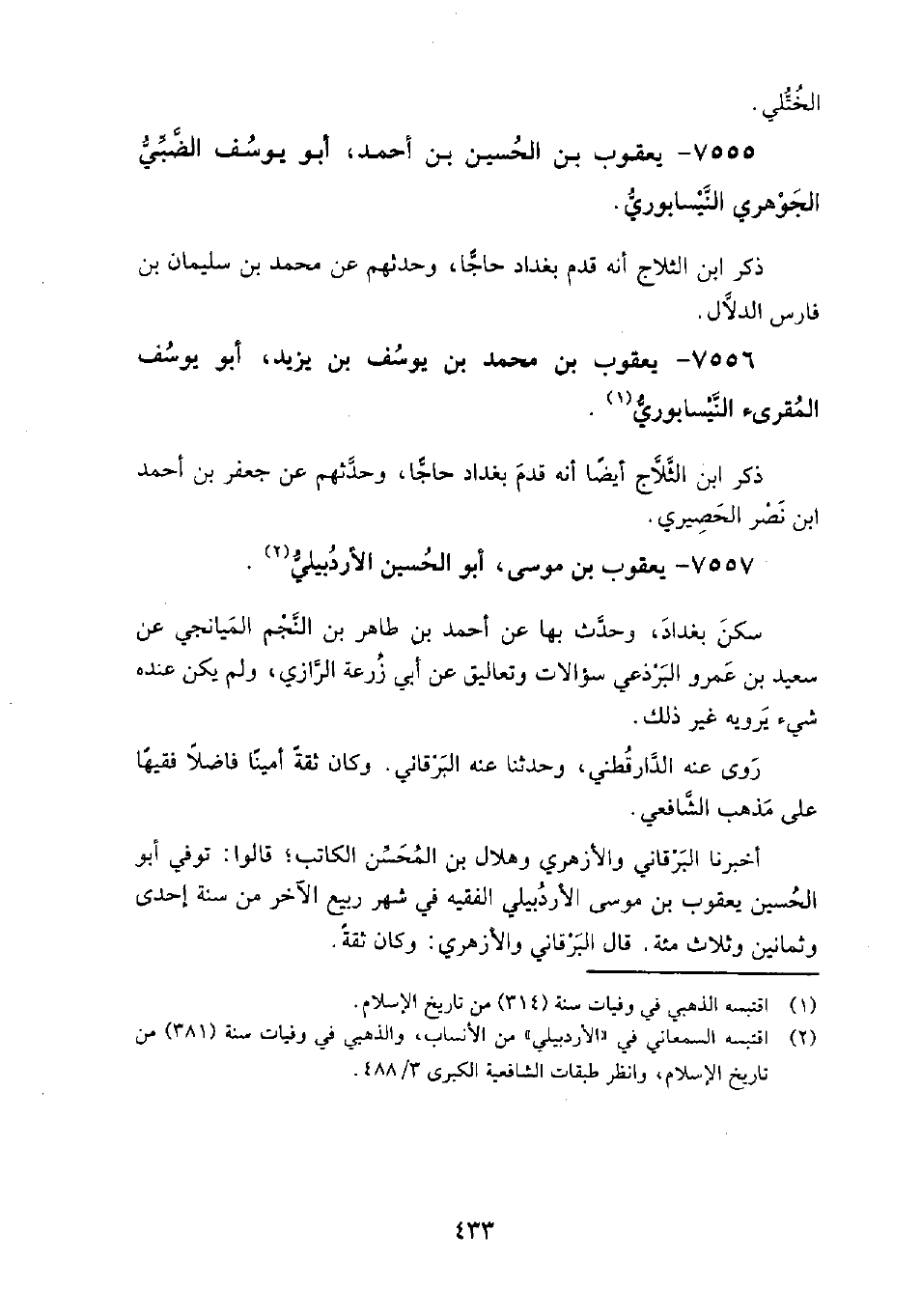 7555 - يعقوب بن الحسين بن أحمد أبو يوسف الضبي الجوهري النيسابوري ذكر ابن الثلاج أنه قدم بغداد حاجًّا، وحدثهم عن: محمد بن سليمان بن فارس الدلال.