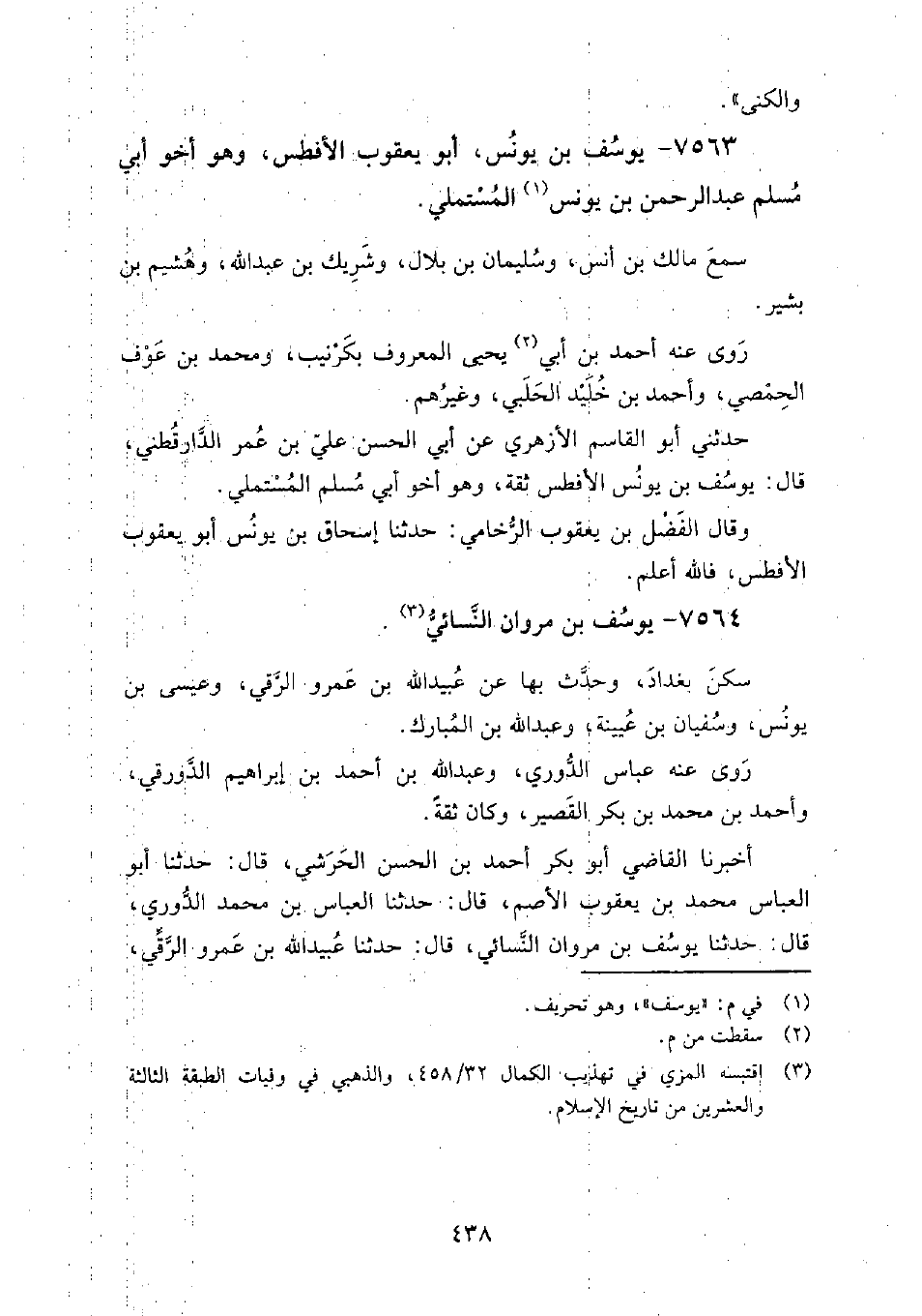 7563 - يوسف بن يونس أبو يعقوب الأفطس وهو أخو أبي مسلم عبد الرحمن بن يونس المستملي سمع: مالك بن أنس، وسليمان بن بلال، وشريك بن عبد الله، وهشيم بن بشير.