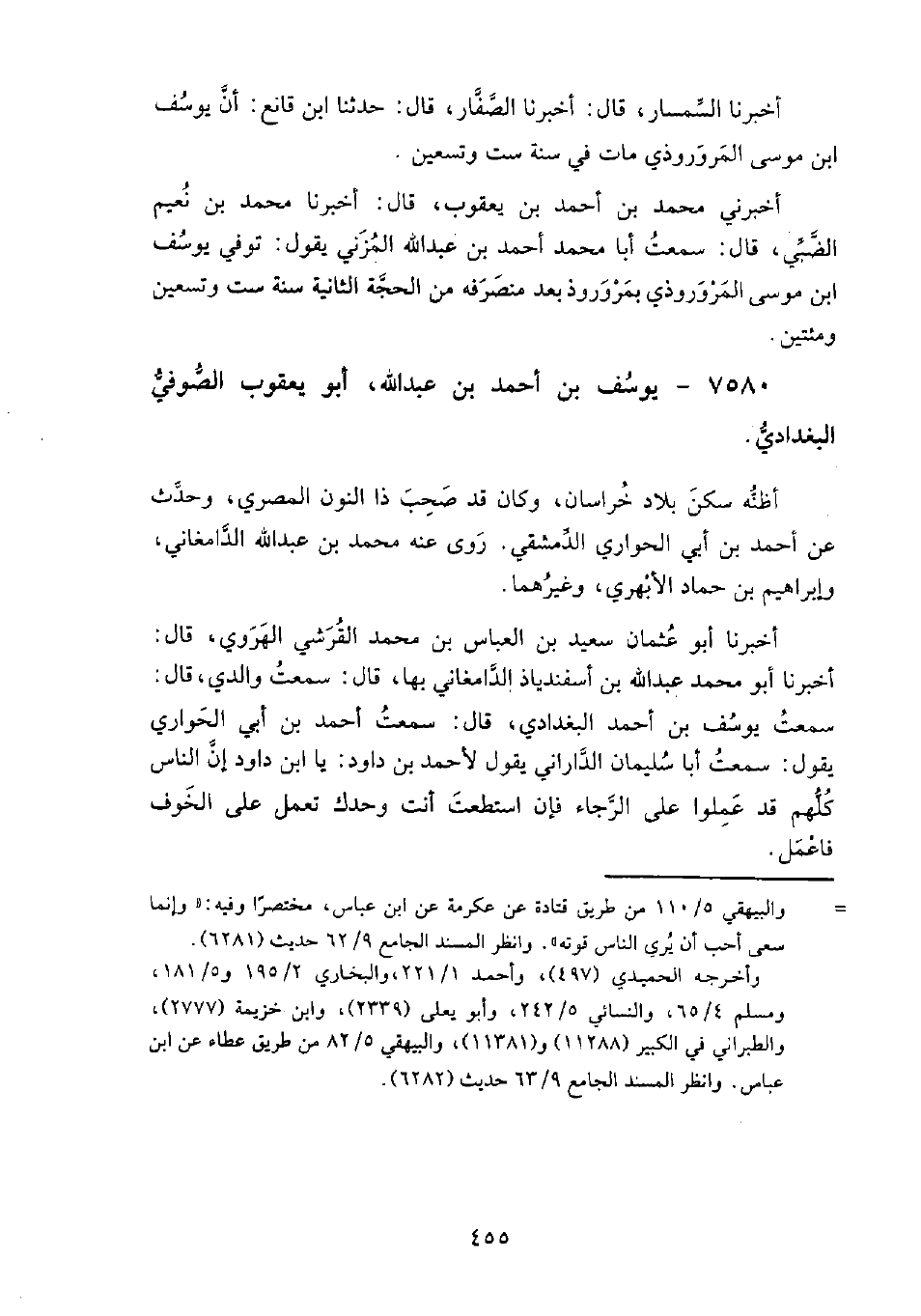 7580 - يوسف بن أحمد بن عبد الله أبو يعقوب الصوفي البغدادي أظنه سكن بلاد خراسان، وكان قد صحب ذا النون المصري، وحدث عن: أحمد بن أبي الحواري الدمشقي.