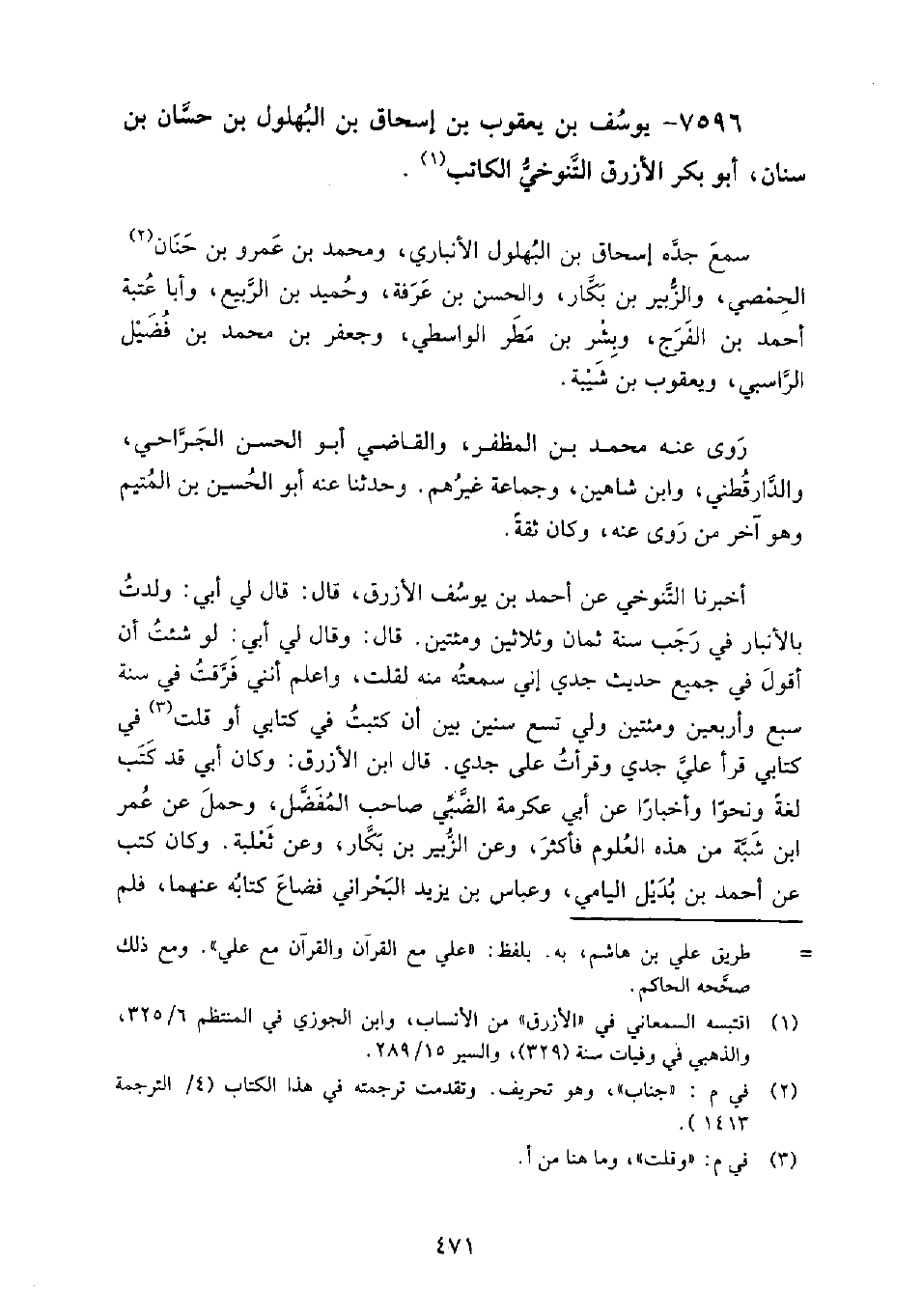 7596 - يوسف بن يعقوب بن إسحاق بن البهلول بن حسان بن سنان أبو بكر الأزرق التنوخي الكاتب سَمِعَ: جده إِسْحَاق بْن البهلول الأنباري، وَمُحَمَّد بْن عمرو بْن حنان الحمصي، والزبير بْن بَكّار، والحسن بْن عرفة، وحُميد بْن الربيع، وأبا عُتبة أَحْمَد بْن الفرج، وبشر بْن مطر الواسطي، وجعفر بْن مُحَمَّد بْن فُضيل الراسبي، ويعقوب بْن شيبة.