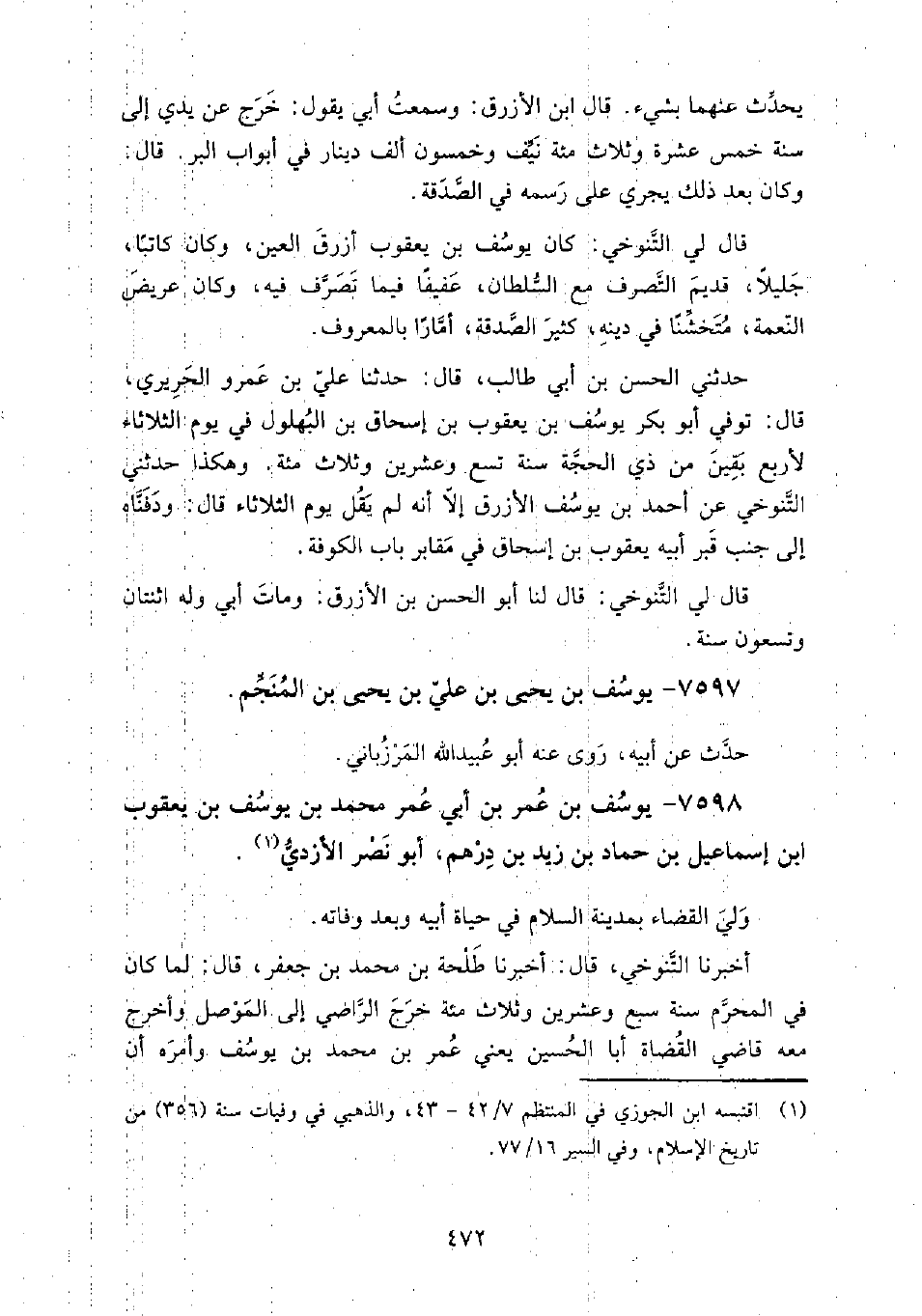 7598 - يوسف بن عمر بن أبي عمر محمد بن يوسف بن يعقوب بن إسماعيل بن حَماد بن زيد بن درهم أبو نصر الأزدي ولي القضاء بِمدينة السلام في حياة أبيه، وبعد وفاته.