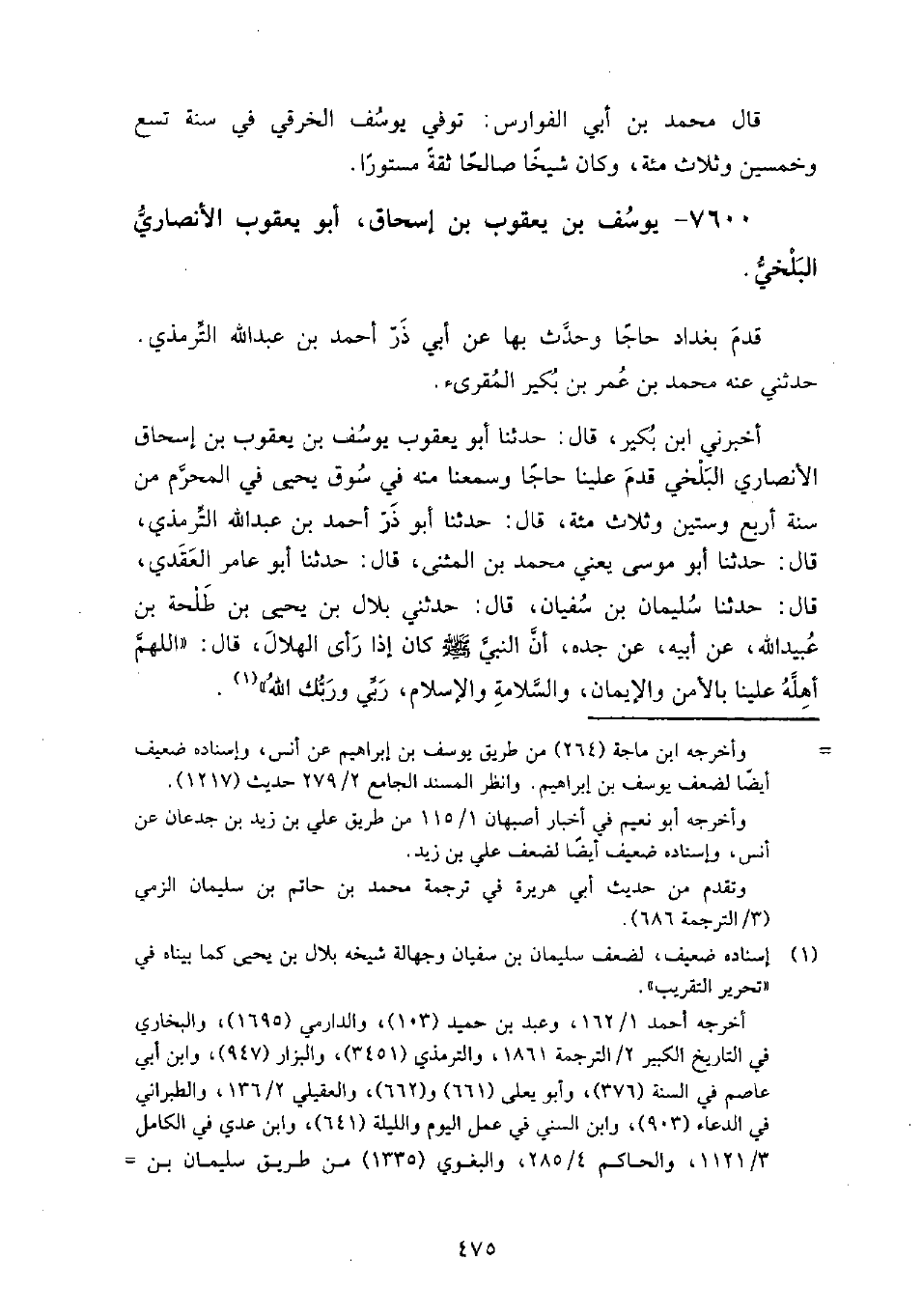 (4793) -[16: 475] أَخْبَرَنِي ابْنُ بُكَيْرٍ، قَالَ: حَدَّثَنَا أَبُو يَعْقُوبَ يُوسُفُ بْنُ يَعْقُوبَ بْنِ إِسْحَاقَ الأَنْصَارِيُّ الْبَلْخِيُّ، قَدِمَ عَلَيْنَا حَاجًّا وَسَمِعْنَا مِنْهُ فِي سُوقِ يَحْيَى فِي الْمُحَرَّمِ مِنْ سَنَةِ أَرْبَعٍ وَسِتِّينَ وَثَلاثِ مِائَةٍ، قَالَ: حَدَّثَنَا أَبُو ذَرٍّ أَحْمَدُ بْنُ عَبْدِ اللَّهِ التِّرْمِذِيُّ، قَالَ: حَدَّثَنَا أَبُو مُوسَى، يَعْنِي: مُحَمَّدَ بْنَ الْمُثَنَّى، قَالَ: حَدَّثَنَا أَبُو عَامِرٍ الْعَقَدِيُّ، قَالَ: حَدَّثَنَا سُلَيْمَانُ بْنُ سُفْيَانَ، قَالَ: حَدَّثَنِي بِلالُ بْنُ يَحْيَى بْنِ طَلْحَةَ بْنِ عُبَيْدِ اللَّهِ، عَنْ أَبِيهِ، عَنْ جَدِّهِ، أَنَّ النَّبِيَّ، صَلَّى اللَّهُ عَلَيْهِ وَسَلَّمَ كَانَ إِذَا رَأَى الْهِلالَ، قَالَ: " اللَّهُمَّ أَهِلَّهُ عَلَيْنَا بِالأَمْنِ وَالإِيمَانِ، وَالسَّلامَةِ وَالإِسْلامِ، رَبِّي وَرَبُّكَ اللَّهُ "