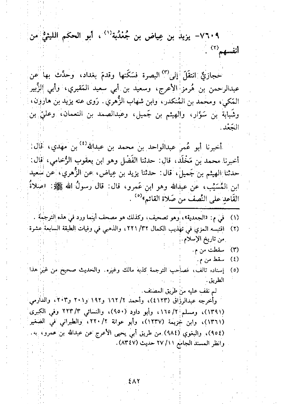 (4796) -[16: 482] أَخْبَرَنَا أَبُو عُمَرَ عَبْدُ الْوَاحِدِ بْنُ مُحَمَّدِ بْنِ عَبْدِ اللَّهِ بْنِ مَهْدِيٍّ، قَالَ: أَخْبَرَنَا مُحَمَّدُ بْنُ مَخْلَدٍ، قَالَ: حَدَّثَنَا الْفَضْلُ وَهُوَ ابْنُ يَعْقُوبَ الرُّخَامِيُّ، قَالَ: حَدَّثَنَا الْهَيْثَمُ بْنُ جَمِيلٍ، قَالَ: حَدَّثَنَا يَزِيدُ بْنُ عِيَاضٍ، عَنِ الزُّهْرِيِّ، عَنْ سَعِيدِ بْنِ الْمُسَيِّبِ، عَنْ عَبْدِ اللَّهِ وَهُوَ ابْنُ عَمْرٍو، قَالَ: قَالَ رَسُولُ اللَّهِ، صَلَّى اللَّهُ عَلَيْهِ وَسَلَّمَ: " صَلاةُ الْقَاعِدِ النِّصْفُ مِنْ صَلاةِ الْقَائِمِ " أَخْبَرَنَا ابن الفضل، قَالَ: أَخْبَرَنَا عَبْد الله بْن جَعْفَر، قَالَ: حَدَّثَنَا يعقوب بْن سُفْيَان، قَالَ: حَدَّثَنَا عَبْد العزيز بْن عمران، قَالَ: حَدَّثَنَا أَبُو زيد عَبْد الحميد بْن الوليد بْن المغيرة، قَالَ: حدَّثَنِي ابن القاسم، قَالَ: سألتُ مالكًا، عَن ابن سمعان، قَالَ: كَذَّاب، قَالَ: قلت: فيزيد بْن عياض؟ قَالَ: أكذب وأكذب.