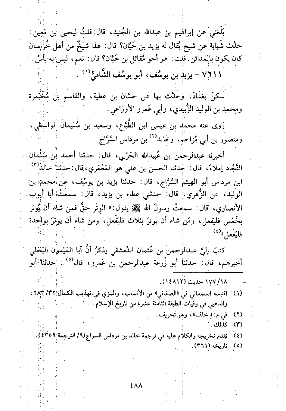 (4799) -[16: 488] أَخْبَرَنَا عَبْدُ الرَّحْمَنِ بْنُ عُبَيْدِ اللَّهِ الْحَرْبِيُّ، قَالَ: حَدَّثَنَا أَحْمَدُ بْنُ سَلْمَانَ النَّجَّادُ، إِمْلاءً، قَالَ: حَدَّثَنَا الْحَسَنُ بْنُ عَلِيٍّ، هُوَ الْمَعْمَرِيُّ، قَالَ: حَدَّثَنَا خَالِدُ بْنُ مِرْدَاسٍ، أَبُو الْهَيْثَمِ السَّرَّاجُ، قَالَ: حَدَّثَنَا يَزِيدُ بْنُ يُوسُفَ، عَنْ مُحَمَّدِ بْنِ الْوَلِيدِ، عَنِ الزُّهْرِيِّ، قَالَ: حَدَّثَنِي عَطَاءُ بْنُ يَزِيدَ، قَالَ: سَمِعْتُ أَبَا أَيُّوبَ الأَنْصَارِيُّ، قَالَ: سَمِعْتُ رَسُولَ اللَّهِ، صَلَّى اللَّهُ عَلَيْهِ وَسَلَّمَ يَقُولُ: " الْوِتْرُ حَقٌّ، فَمَنْ شَاءَ أَنْ يُوتِرَ بِخَمْسٍ فَلْيَفْعَلْ، وَمَنْ شَاءَ أَنْ يُوتِرَ بِثَلاثٍ فَلْيَفْعَلْ، وَمَنْ شَاءَ أَنْ يُوتِرَ بِوَاحِدَةٍ فَلْيَفْعَلْ " كتب إليّ عَبْد الرَّحْمَن بْن عُثمان الدمشقي، يذكر أن أَبَا الميمون البجلي أخبرهم، قَالَ: حَدَّثَنَا أَبُو زرعة عَبْد الرَّحْمَن بْن عمرو، قَالَ: حَدَّثَنَا أَبُو مسهر، قَالَ: سمعتُ سَعِيد بْن عَبْد العزيز، يَقُولُ: عالِما هذا الْجُند بعد الأوزاعي يزيد بْن السمط، ويزيد بْن يوسف أَخْبَرَنَا العتيقي، قَالَ: أَخْبَرَنَا يوسف بْن أَحْمَد الصيدلاني، قَالَ: حَدَّثَنَا مُحَمَّد بْن عمرو العقيلي، قَالَ: حَدَّثَنَا عَبْد الله بْن أَحْمَد، قَالَ: سَمِعْتُ أبي يَقُولُ: رأيتُ يزيد بْن يوسف أَبَا يوسف الشامي، وكان قد رأى حسَّان بْن عطية، قَالَ أبي: رأيتُ عَلَيْهِ إزارًا أصفر ولَم أكتب عَنْهُ شيئًا أَخْبَرَنِي عَبْد الله بْن يَحْيَى السكري، قَالَ: أَخْبَرَنِي مُحَمَّد بْن عَبْد الله الشافعي، قَالَ: حَدَّثَنَا جَعْفَر بْن مُحَمَّد بْن الأزهر، قَالَ: حَدَّثَنَا ابن الغَلابي، قَالَ: قَالَ أَبُو زكريا: يزيد بْن يوسف شامي لَيْسَ بثقة، رَوى عَن: حسَّان بْن عطية، وعن الأوزاعي، قد رأيته كان نازلا على أبي عبيد الله أَخْبَرَنَا عُبَيْد الله بْن عُمَر الواعظ، قَالَ: حَدَّثَنَا أبي، قَالَ: حَدَّثَنَا مُحَمَّد بْن مخلد، قَالَ: حَدَّثَنَا عَبَّاس بْن مُحَمَّد، قَالَ: سمعتُ يَحْيَى، يَقُولُ: يزيد بْن يوسف كَانَ شاميًا نزل عَلَى أبي عُبَيْد الله وزير المهدي، وكان يُحدث عَن: القاسم بْن مُخيمرة، وقد حَدَّث عَنْهُ: الوليد بْن مُسلم، وليس بشيء