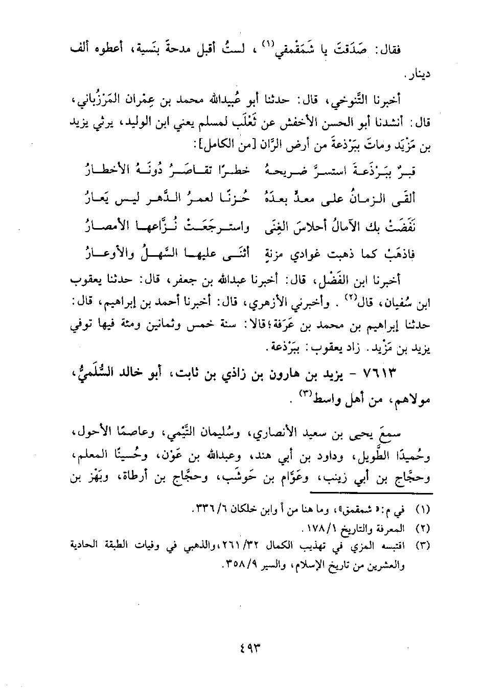 7613 - يزيد بن هارون بن زاذي بن ثابت أبو خالد السلمي مولاهم من أهل واسط، سمع: يحيى بن سعيد الأنصاري، وسليمان التيمي، وعاصمًا الأحول، وحُميدًا الطويل، وداود بن أبي هند، وعبد الله بن عون، وحسينًا المعلم، وحجاج بن أبي زينب، وعوام بن حوشب، وحجاج بن أرطاة، وبَهْز بن حكيم، وهشام بن حسان، وأبا غسان محمد بن مطرِّف، وشعبة بن الحجاج، ومحمد بن عمرو الليثي، والحمادين، وخلقًا سواهم.