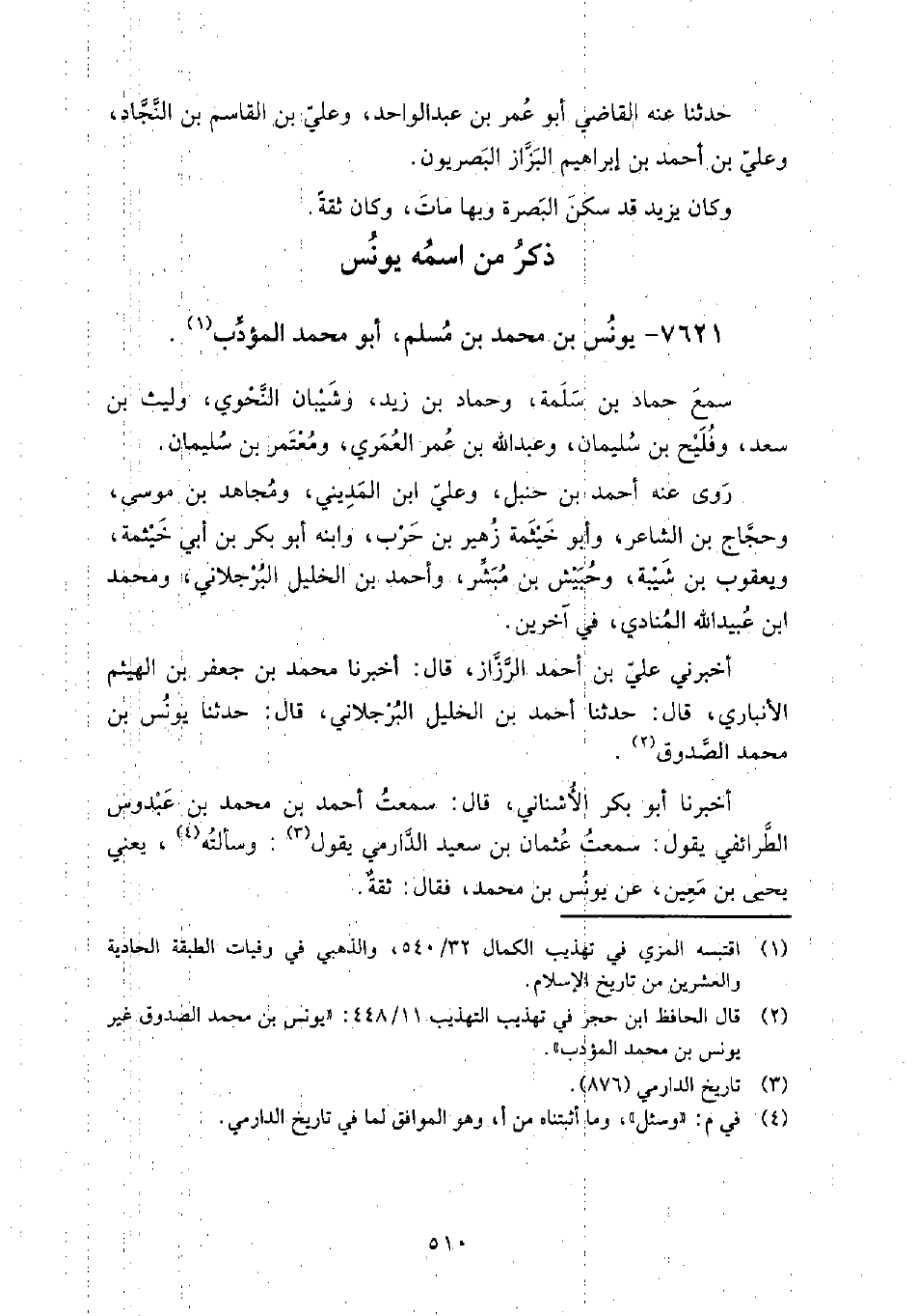 7621 - يونس بن محمد بن مسلم أبو محمد المؤدب سَمِعَ: حماد بْن سلمة، وحماد بْن زيد، وشيبان النحوي، وليث بْن سعد، وفُلَيْح بْن سُلَيْمَان، وعبد الله بْن عُمَر العمري، ومعتمر بْن سُلَيْمَان.