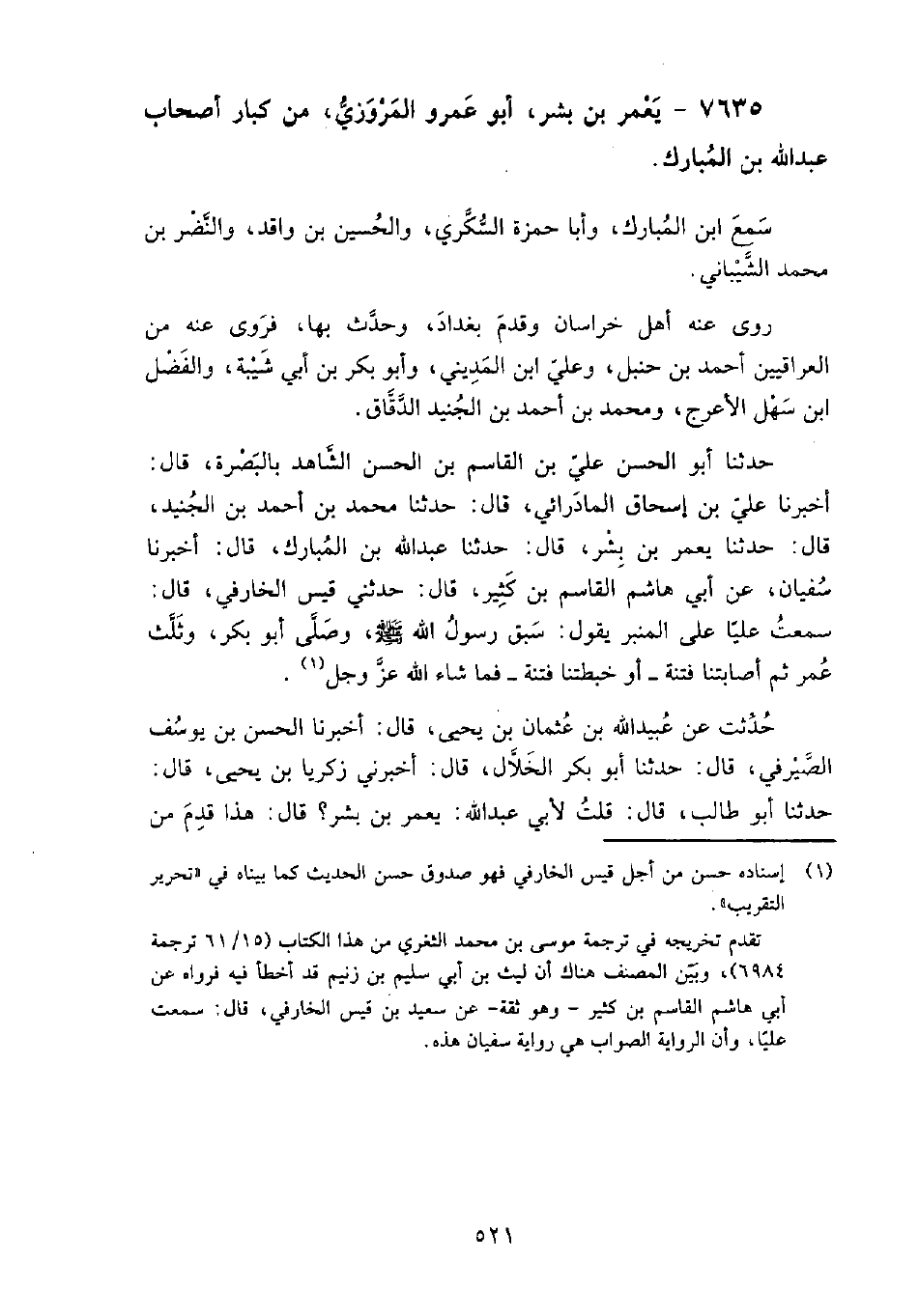 7635 - يَعْمُر بْن بشر أَبُو عمرو الْمَرْوَزِيّ من كبار أصحاب عَبْد الله بْن المبارك سَمِعَ: ابن المبارك، وأبا حمزة السكري، والحسين بْن واقد، والنضر بْن مُحَمَّد الشيباني.
