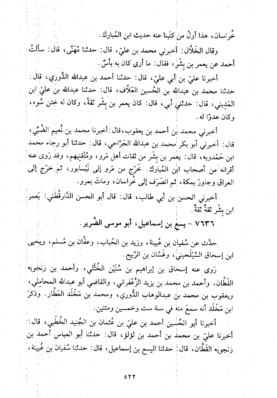 7636 - يسع بن إسماعيل أبو موسى الضرير حدث عن: سفيان بن عيينة، وزيد بن الحباب، وعفان بن مسلم، ويحيى بن إسحاق السيلحيني، وغسان بن الربيع.
