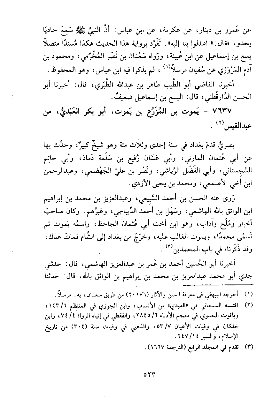 (4811) أَخْبَرَنَا أَبُو الْحُسَيْنِ أَحْمَدُ بْنُ عُمَرَ بْنِ عَبْدِ الْعَزِيزِ الْهَاشِمِيُّ، قَالَ: حَدَّثَنِي جَدِّي أَبُو مُحَمَّدٍ عَبْدُ الْعَزِيزِ بْنُ مُحَمَّدِ بْنِ إِبْرَاهِيمَ بْنِ الْوَاثِقِ بِاللَّهِ، قَالَ: حَدَّثَنَا أَبُو بَكْرٍ يَمُوتُ بْنُ الْمزرعِ بْنِ يَمُوتَ بْنِ عِيسَى بْنِ مُوسَى الْعَبْدِيُّ، سَنَةَ اثْنَتَيْنِ وَثَلاثِ مِائَةٍ، قَالَ: حَدَّثَنَا مُحَمَّدُ بْنُ يَحْيَى الْأَزْدِيُّ، قَالَ: حَدَّثَنَا حَفْصُ بْنُ عُمَرَ الْحَوْضِيُّ، عَنِ الْحَسَنِ بْنِ عَجْلانَ، عَنِ الزُّبَيْرِ بْنِ الْخِرِّيتِ، عَنْ عِكْرِمَةَ، قَالَ: أَحْسَبُهُ عَنِ ابْنِ عَبَّاسٍ، قَالَ: مَا صَرَفَ اللَّهُ تَعَالَى سُلَيْمَانَ عَنِ الْهُدْهُدِ أَنْ يَذْبَحَهُ إِلا بِبِرِّ الْهُدْهُدِ بِأُمِّهِ أَخْبَرَنَا الجوهري، قَالَ: حَدَّثَنَا مُحَمَّد بْن الْعَبَّاس، قَالَ: حَدَّثَنَا أَبُو عَبْد الله أَحْمَد بْن مُحَمَّد بْن إِبْرَاهِيم الأنباري، قَالَ: قَالَ لنا يَموت بْن المزرع بْن يَموت بْن عُدُس بْن سيَّار بْن المزرع بْن الحارث بْن ثَعلبة بْن عمرو بْن ضمرة بْن دِلْهَاث بْن وديعة بْن بَكْر بْن وديعة بْن بَكْر بْن لُكيز بْن أفصى بْن عَبْد القيس بْن أفصى بْن دُعمي بْن جَديلة بْن أسد بْن ربيعة بْن نزار: سَمِعْتُ الجاحظ، يَقُولُ: السكباجة من جند البلد، لا يضرب عليها بعث، وقال: هِيَ قديمة الصحبة وَأَخْبَرَنَا الجوهري، قَالَ: حَدَّثَنَا ابن حَيُّويه، قَالَ: أنشدنا أَحْمَد بْن مُحَمَّد الأنباري، قَالَ: أنشدني يَموت بْن المزرع لنفسه: