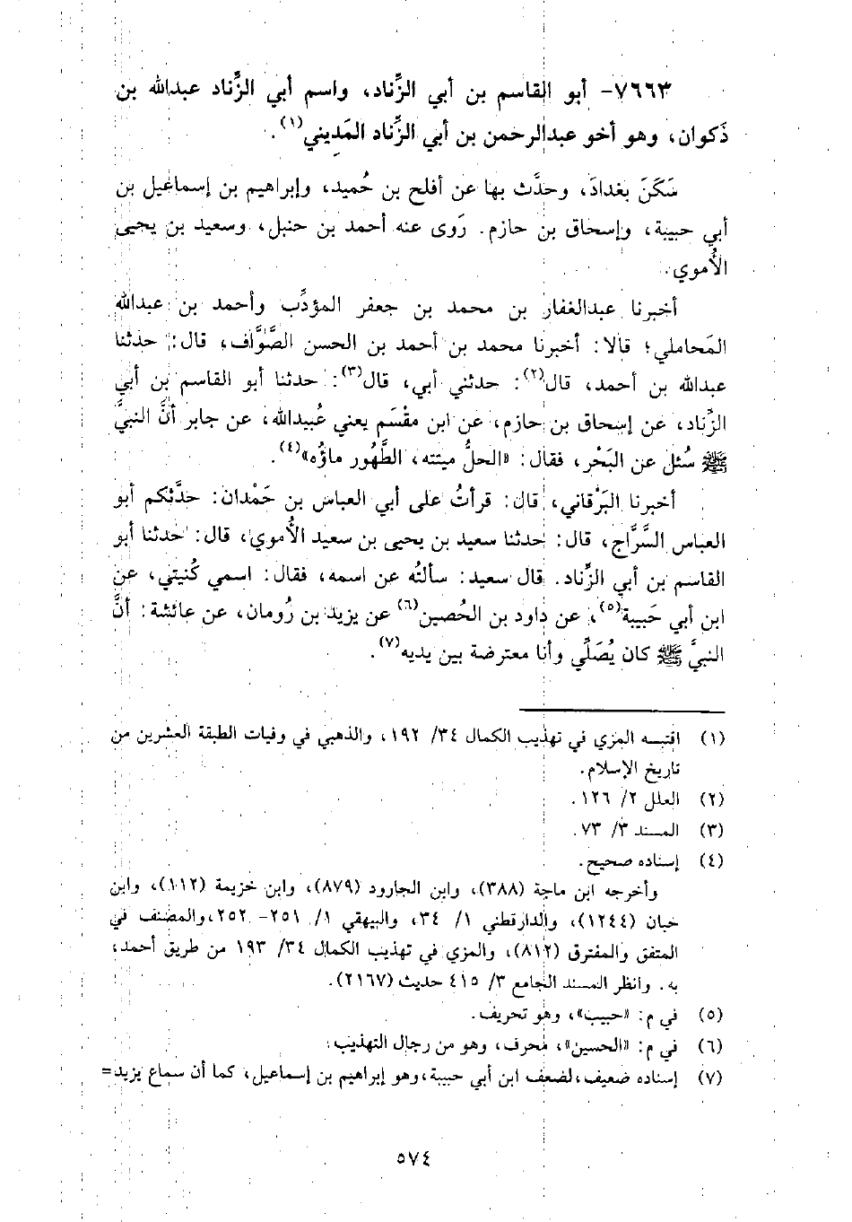 7663 - أبو القاسم بن أبي الزناد واسم أبي الزناد عبد الله بن ذكوان وهو أخو عبد الرحمن بن أبي الزناد المديني سكن بغداد، وحدث بِهَا عَن: أفلح بْن حُميد، وإبراهيم بْن إِسْمَاعِيل بْن أبي حبيبة، وإسحاق بْن حازم.