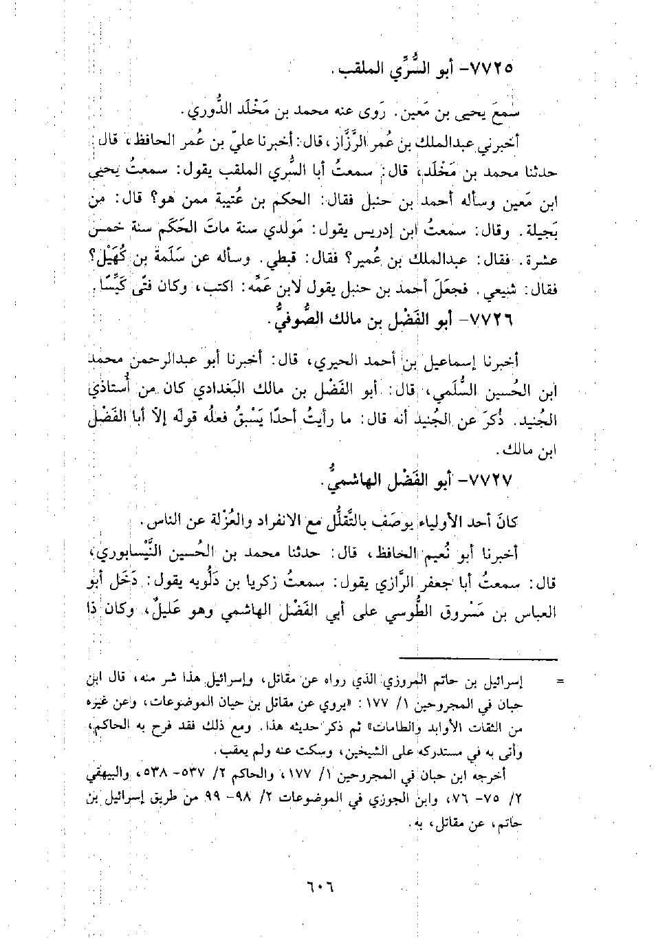 7726 - أبو الفضل بن مالك الصوفي أَخْبَرَنَا إِسْمَاعِيل بْن أَحْمَد الحيري، قَالَ: أَخْبَرَنَا أَبُو عَبْد الرَّحْمَن مُحَمَّد بْن الْحُسَيْن السلمي، قَالَ: أَبُو الفضل بْن مالك البغدادي كَانَ من أستاذي الجنيد.