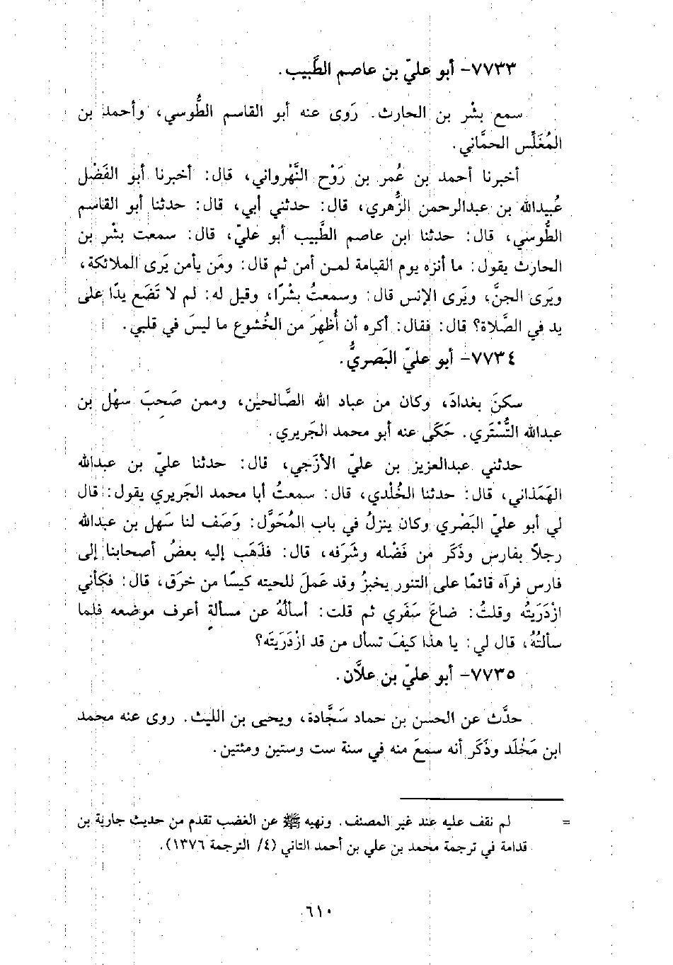 7734 - أبو علي البصري سكن بغداد، وكان من عباد الله الصالحين، ومِمن صحب: سهل بن عبد الله التستري.