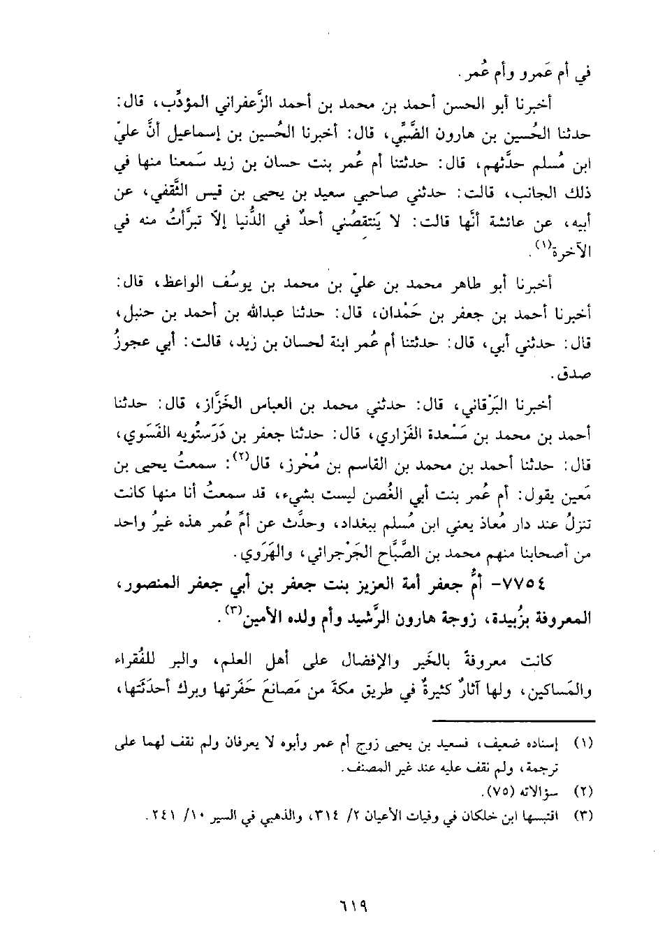 7754 - أم جعفر أمة العزيز بنت جعفر بن أبي جعفر المنصور المعروفة بزبيدة زوجة هارون الرشيد وأم ولده الأمين كانت معروفة بالخير والإفضال على أهل العلم، والبر للفقراء والمساكين، ولَها آثار كثيرة في طريق مكة من مصانع حفرتْها، وبرك أحدثتها، وكذلك بِمكة والمدينة، وليس في بنات هاشم عباسية ولدت خليفة إلا هي، ويقال: إنها وُلدت في حياة المنصور، فكان المنصور يرقصها وهي صغيرة، ويقول لَها: أنت زُبدة، وأنت زُبيدة، فغلب ذلك على اسمها.