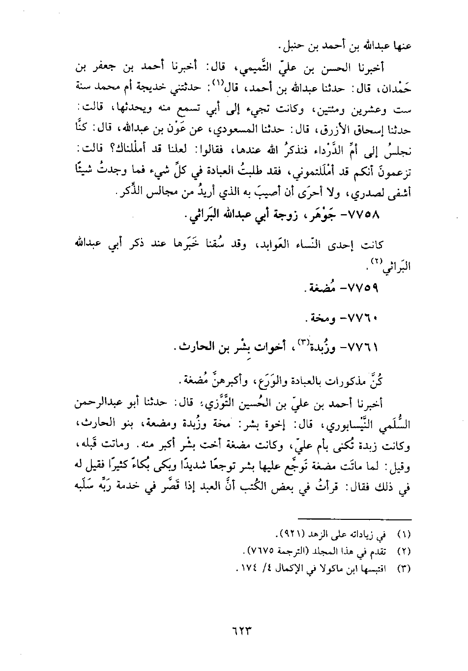 7761 - وزبدة أخوات بشر بن الحارث كن مذكورات بالعبادة والورع، وأكبرهن مضغة أَخْبَرَنَا أَحْمَد بْن عَلِيّ بْن الْحُسَيْن التوزي، قَالَ: حَدَّثَنَا أَبُو عَبْد الرَّحْمَن السلمي النيسابوري، قَالَ: إخوة بشر: مخة، وزُبدة، ومضغة بنو الحارث، وكانت زبدة تُكنى بأم علي، وكانت مضغة أخت بشر أكبر منه، وماتت قبله، وقيل: لما ماتت مضغة تَوجع عليها بشر توجعًا شديدًا، وبَكى بُكاءً كثيرًا، فقيل لَهُ فِي ذَلِكَ، فقال: قرأتُ فِي بعض الكتب أن العبد إذا قَصَّر فِي خدمة ربه سلبه أنيسه، وهذه كانت أنيسي فِي الدُّنْيَا قلت: ذكر إِبْرَاهِيم الحربي أن بشرًا قَالَ هذا يوم ماتت أخته مخة، فالله أعلم.