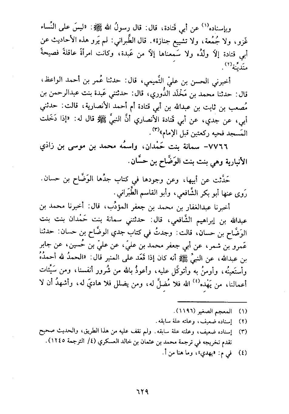 7766 - سَمانة بنت حمدان واسمه مُحمد بن موسى بن زاذي الأنبارية وهي بنت بنت الوضاح بن حسان حدثت عن: أبيها، وعن جدها وجادة في كتاب جدها الوضاح بن حسان.