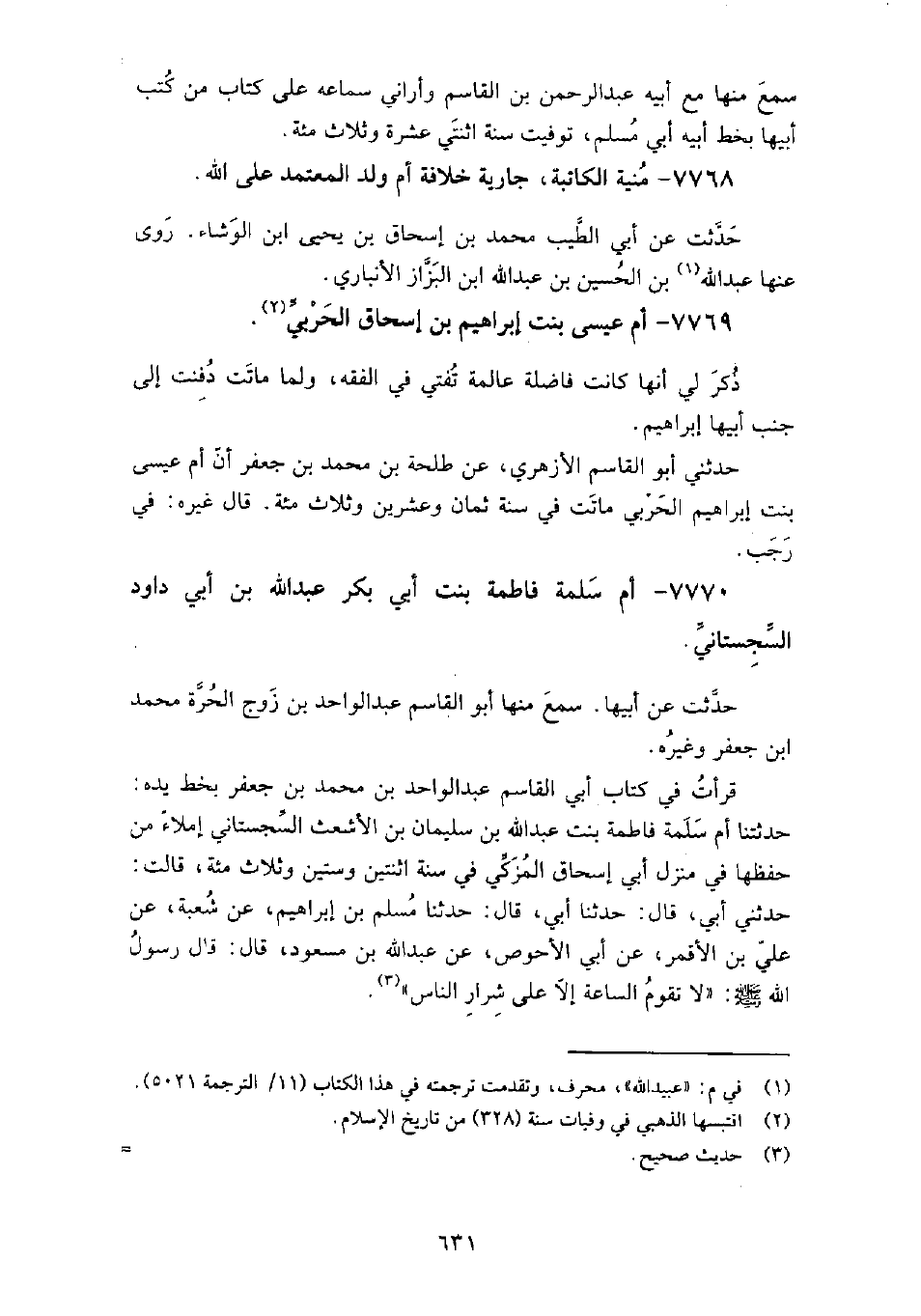 7769 - أم عيسى بنت إبراهيم بن إسحاق الحربي ذُكِرَ لي أنَّها كانت فاضلة عالِمة تفتي في الفقه، ولَما ماتت دُفنت إلى جنب أبيها إبراهيم.