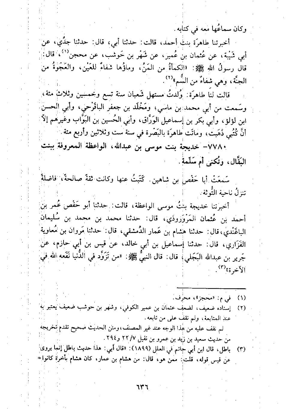 (4858) -[16: 636] أَخْبَرَتْنَا خَدِيجَةُ بِنْتُ مُوسَى الْوَاعِظَةُ، قَالَتْ: حَدَّثَنَا أَبُو حَفْصٍ عُمَرُ بْنُ أَحْمَدَ بْنِ عُثْمَانَ الْمَرْوَرُّوذِيُّ، قَالَ: حَدَّثَنَا مُحَمَّدُ بْنُ مُحَمَّدِ بْنِ سُلَيْمَانَ الْبَاغَنْدِيُّ، قَالَ: حَدَّثَنَا هِشَامُ بْنُ عَمَّارٍ الدِّمْشَقِيُّ، قَالَ: حَدَّثَنَا مَرْوَانُ بْنُ مُعَاوِيَةَ الْفَزَارِيُّ، قَالَ: حَدَّثَنَا إِسْمَاعِيلُ بْنُ أَبِي خَالِدٍ، عَنْ قَيْسِ بْنِ أَبِي حَازِمٍ، عَنْ جَرِيرِ بْنِ عَبْدِ اللَّهِ الْبَجَلِيِّ، قَالَ: قَالَ النَّبِيُّ، صَلَّى اللَّهُ عَلَيْهِ وَسَلَّمَ: " مَنْ تَزَوَّدَ فِي الدُّنْيَا نَفَعَهُ اللَّهُ فِي الآخِرَةِ " ماتت خديجة بِنْت البقال فِي جُمادى الآخرة من سنة سبع وثلاثين وأربع مائة، ودُفنت فِي مقبرة الشونيزي.