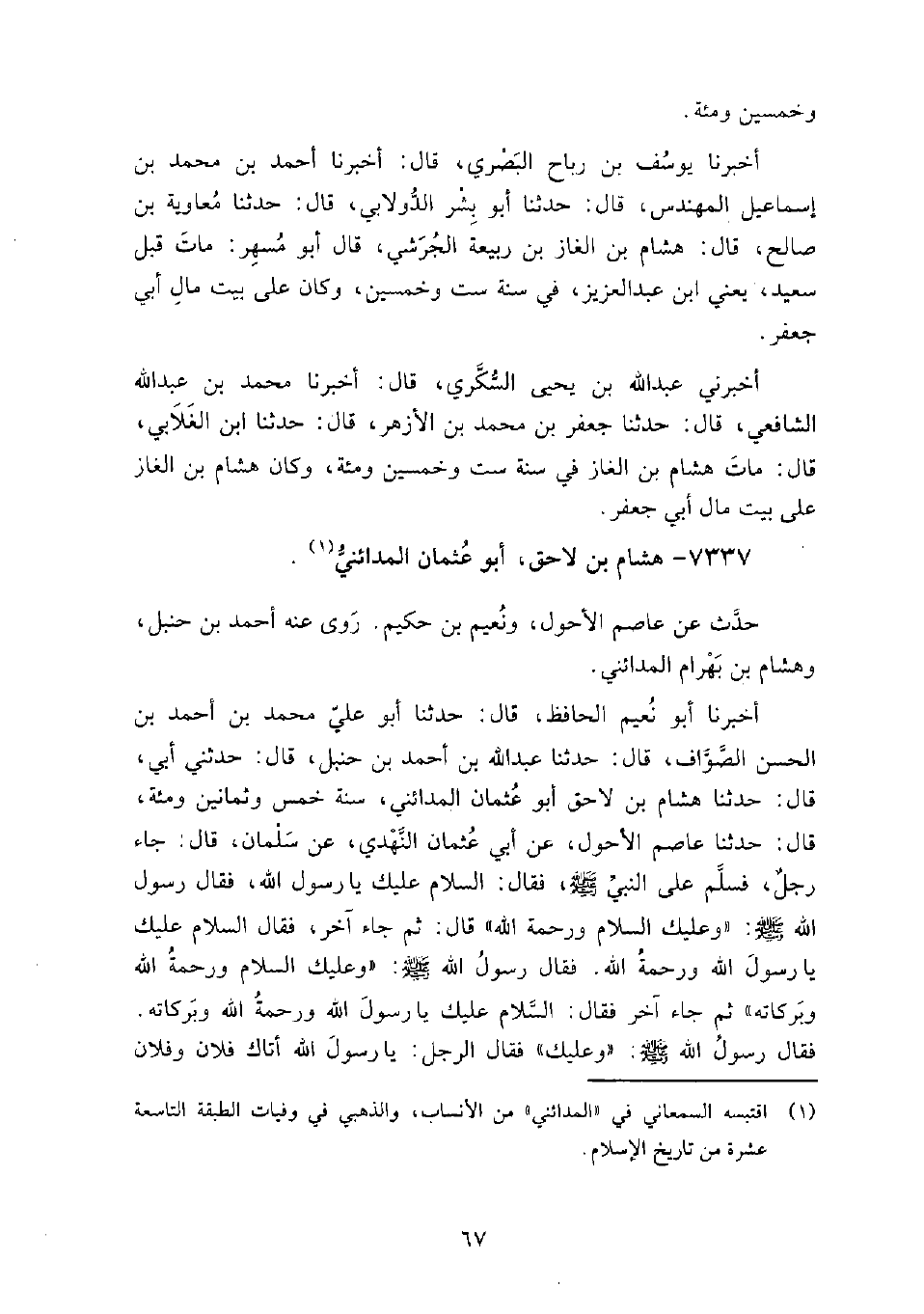 (4620) -[16: 67] أَخْبَرَنَا أَبُو نُعَيْمٍ الْحَافِظُ، قَالَ: حَدَّثَنَا أَبُو عَلِيٍّ مُحَمَّدُ بْنُ أَحْمَدَ بْنِ الْحَسَنِ الصَّوَّافُ، قَالَ: حَدَّثَنَا عَبْدُ اللَّهِ بْنُ أَحْمَدَ بْنِ حَنْبَلٍ، قَالَ: حَدَّثَنِي أَبِي، قَالَ: حَدَّثَنَا هِشَامُ بْنُ لاحِقٍ أَبُو عُثْمَانَ الْمَدَائِنِيُّ، سَنَةَ خَمْسٍ وَثَمَانِينَ وَمِائَةٍ، قَالَ: حَدَّثَنَا عَاصِمٌ الأَحْوَلُ، عَنْ أَبِي عُثْمَانَ النَّهْدِيُّ، عَنْ سَلْمَانَ، قَالَ: جَاءَ رَجُلٌ، فَسَلَّمَ عَلَى النَّبِيِّ، صَلَّى اللَّهُ عَلَيْهِ وَسَلَّمَ فَقَالَ: السَّلامُ عَلَيْكَ يَا رَسُولَ اللَّهِ، فَقَالَ رَسُولُ اللَّهِ، صَلَّى اللَّهُ عَلَيْهِ وَسَلَّمَ: " وَعَلَيْكَ السَّلامُ وَرَحْمَةُ اللَّهِ "، قَالَ: ثُمَّ جَاءَ آخَرُ، فَقَالَ: السَّلامُ عَلَيْكَ يَا رَسُولَ اللَّهِ وَرَحْمَةُ اللَّهِ، فَقَالَ رَسُولُ اللَّهِ، صَلَّى اللَّهُ عَلَيْهِ وَسَلَّمَ: " وَعَلَيْكَ السَّلامُ وَرَحْمَةُ اللَّهِ وَبَرَكَاتُهُ ".