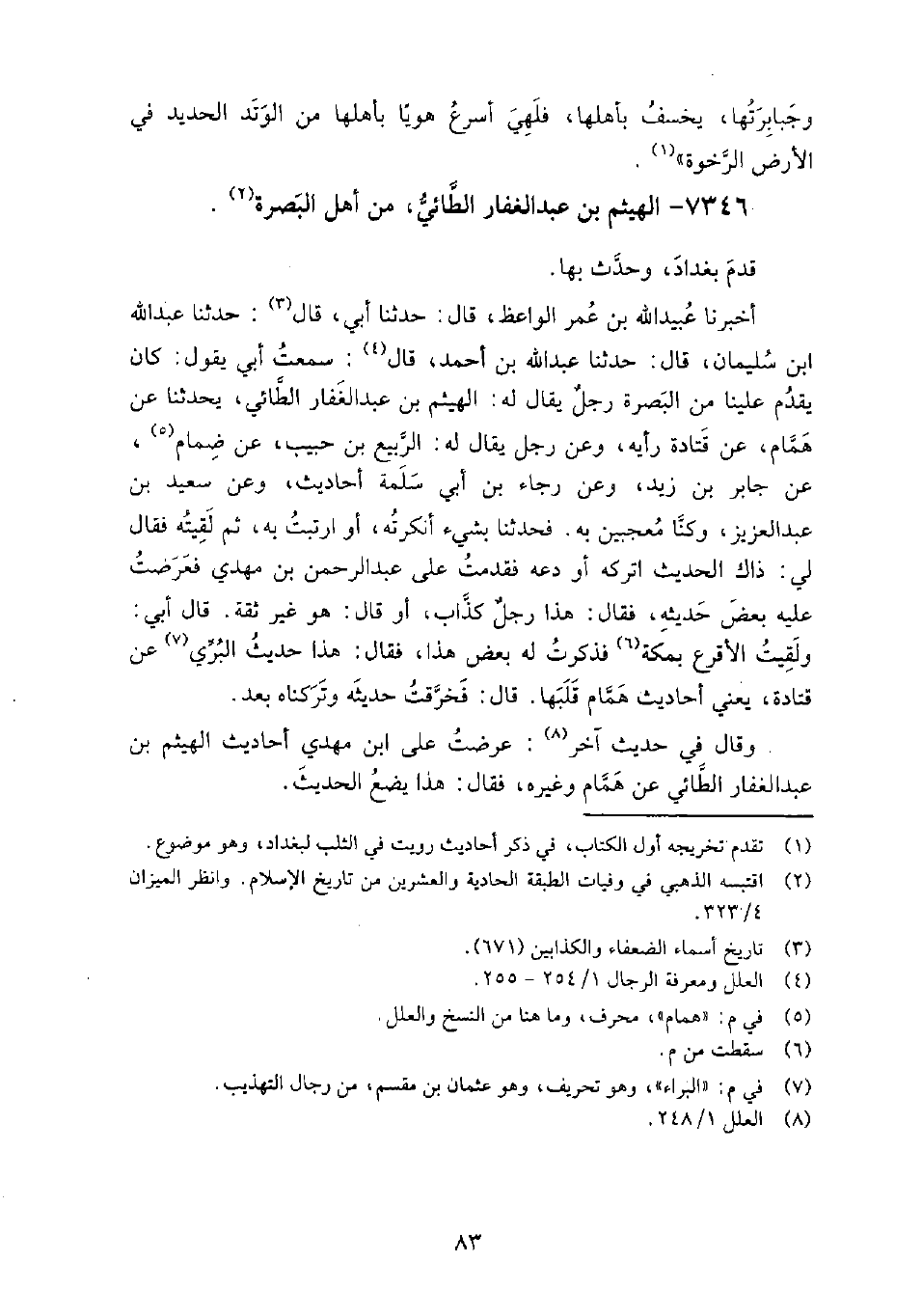 7346 - الهيثم بن عبد الغفار الطائي من أهل البصرة، قدم بغداد، وحدث بِهَا.