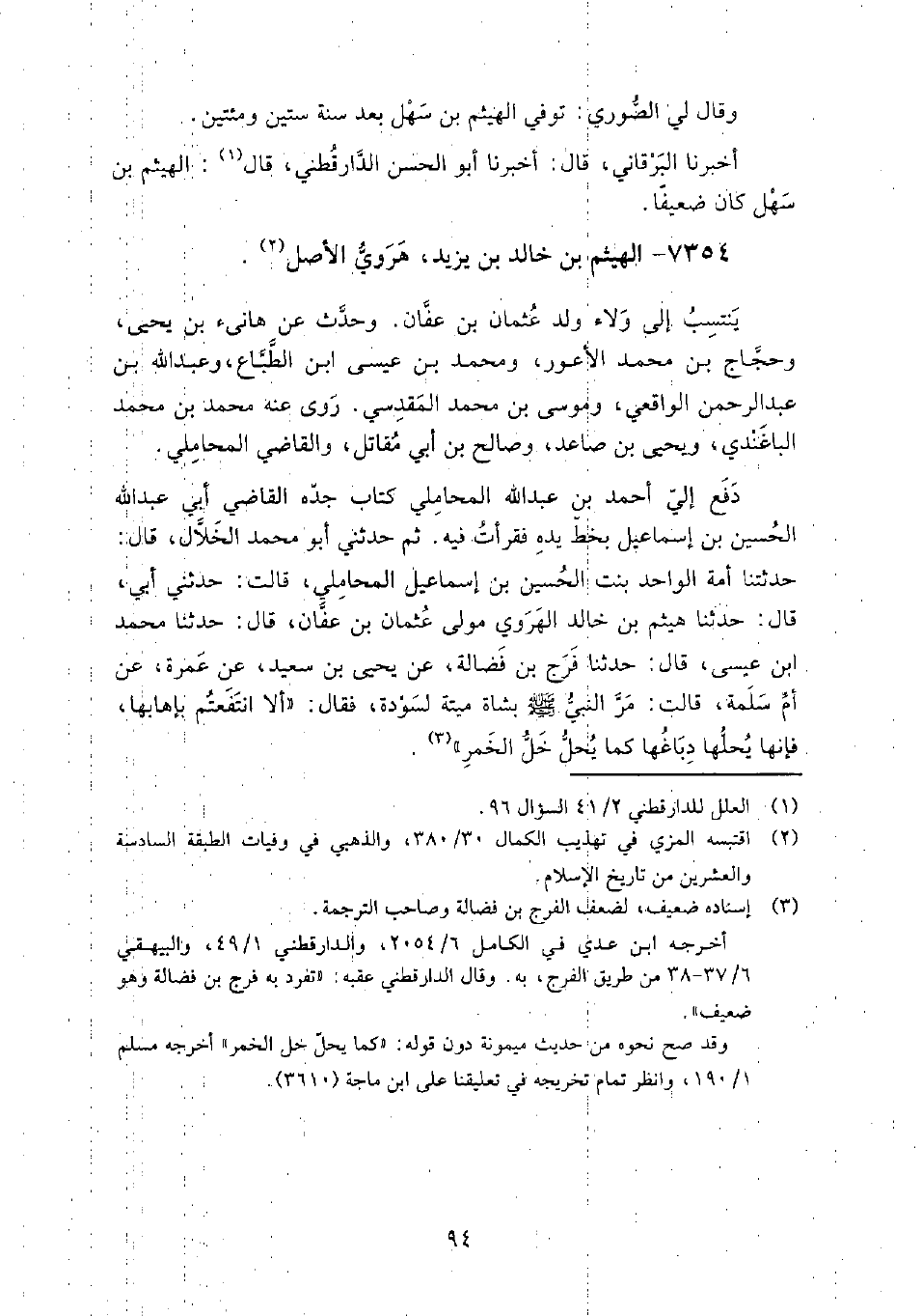 7354 - الْهَيْثَم بن خالد بن يزيد هروي الأصل ينتسب إلى ولاء ولد عُثمان بْن عفَّان، وحدث عَن: هانئ بْن يَحْيَى، وحجاج بْن مُحَمَّد الأعور، وَمُحَمَّد بْن عيسى ابْن الطباع، وعبد الله بْن عَبْد الرَّحْمَن الواقعي، وموسى بْن مُحَمَّد المقدسي.