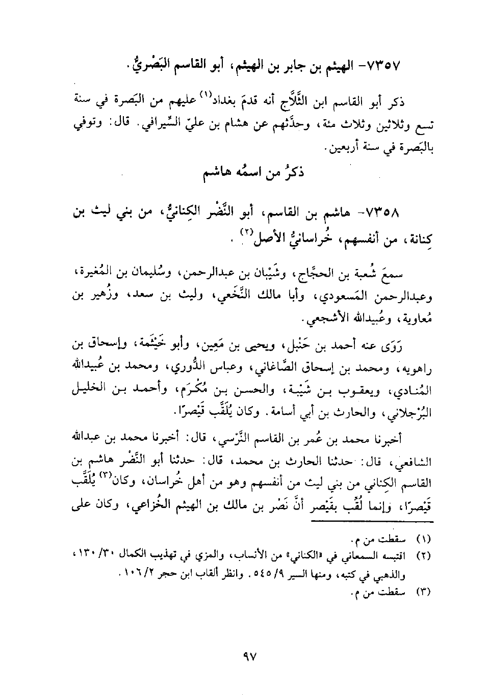 7358 - هاشم بن القاسم أبو النضر الكناني من بني ليث بن كنانة من أنفسهم خراساني الأصل
