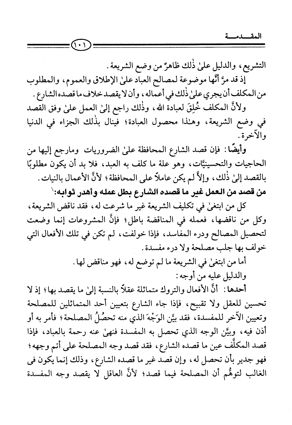 وأيضًا: فإن قصد الشَّارع المحافظة على الضروريات وما رجع إليها من الحاجيات والتحسينيَّات، وهو علة ما كلف به العبد، فلابد أن يكون مطلوبًّا بالقصد إلا ذلك، وإلاَّ لم يكن عاملاً على المحافظة؛ لأنَّ الأعمال بالنيات.